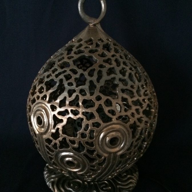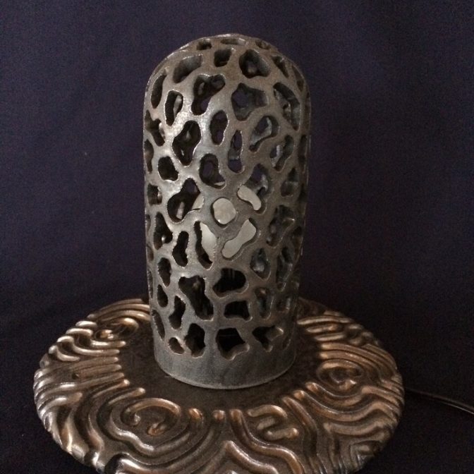 全体に透かし彫りを施した陶器製のインテリアランプです。