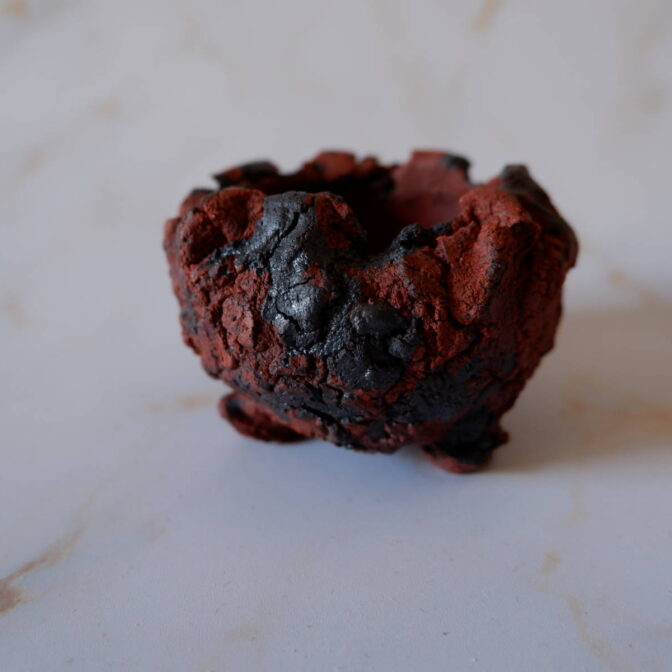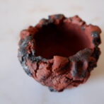 本作は、植木鉢の化粧砂として用いる富士砂(富士山の火山灰)を土に練り込んだ手捻りの三脚鉢です。