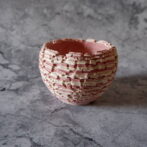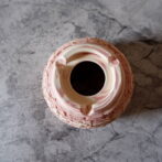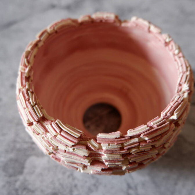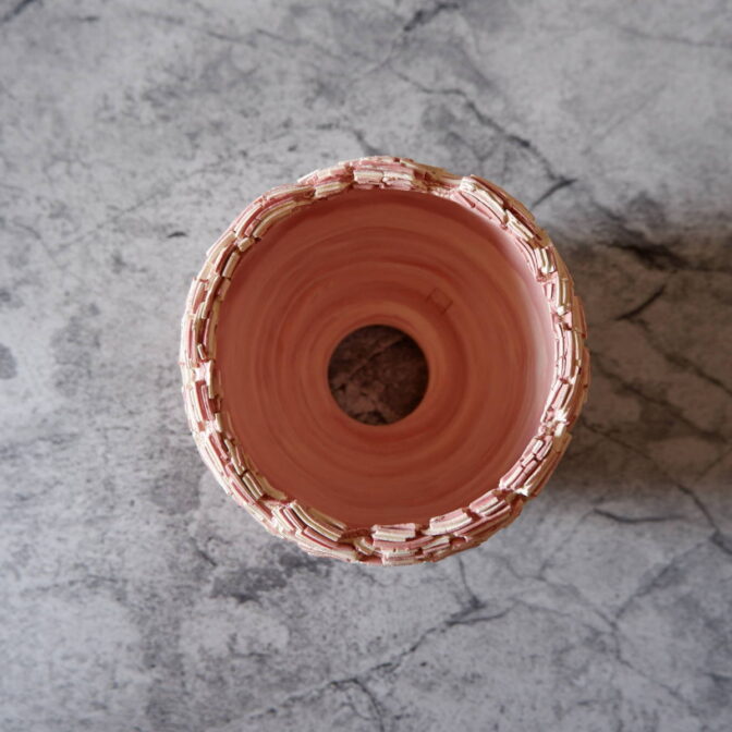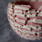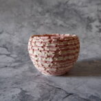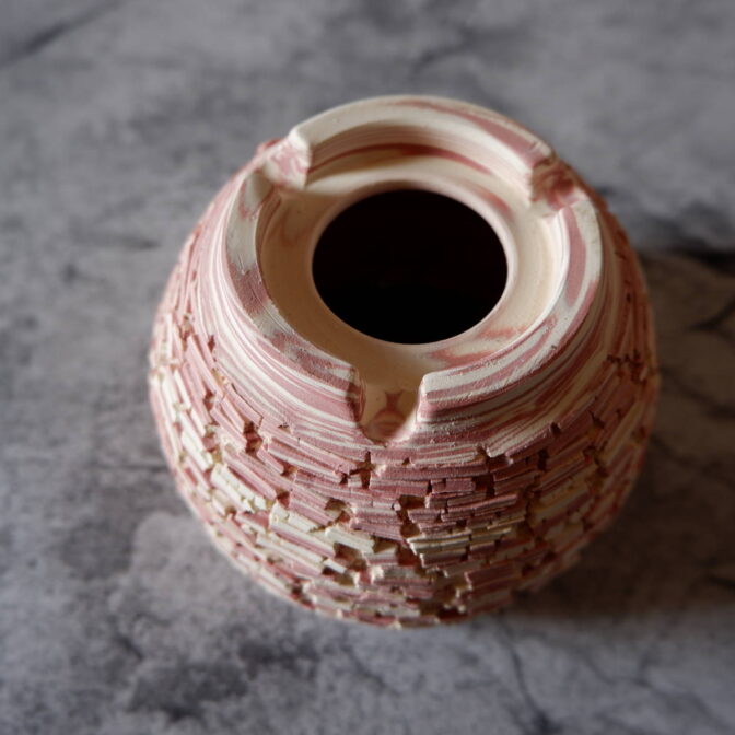 本作は、白と濃淡2種のピンク色の3色の土を練り込んで、側面にひび割れ模様の裂紋(嘯裂文:しょうれつもん)を施しました。