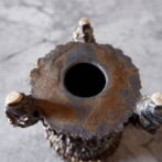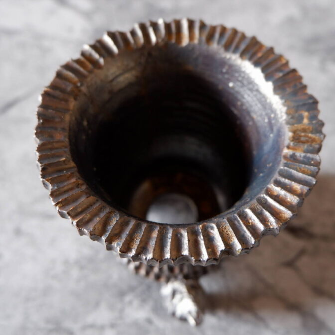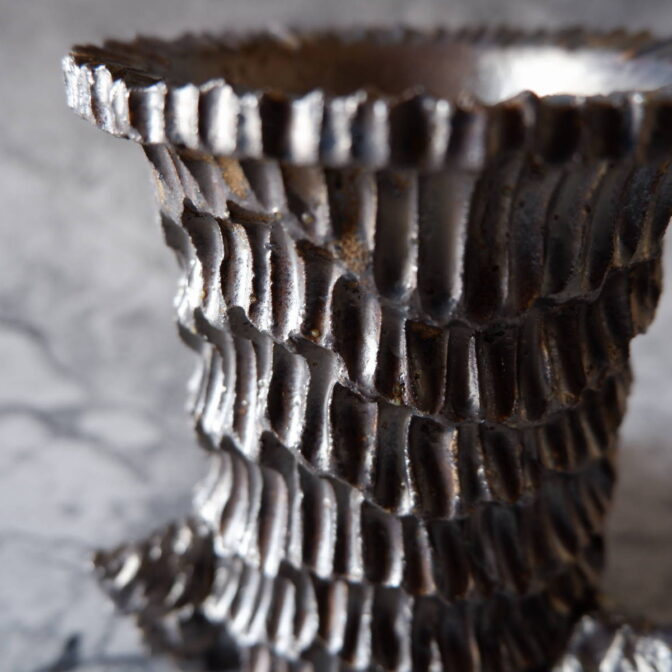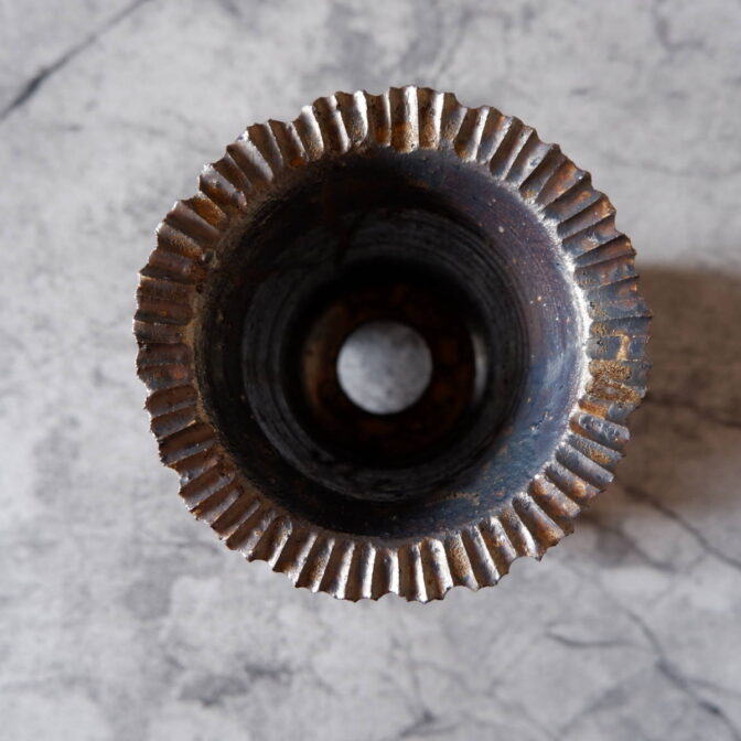 縁や溝など釉薬が溜まって濃く掛かった部分はブロンズ色が明るく発色していますが、全体的には光沢を抑えたメタリック感のある黒っぽいこげ茶、錆びた金属のような渋い発色です。