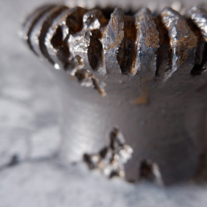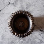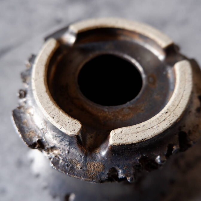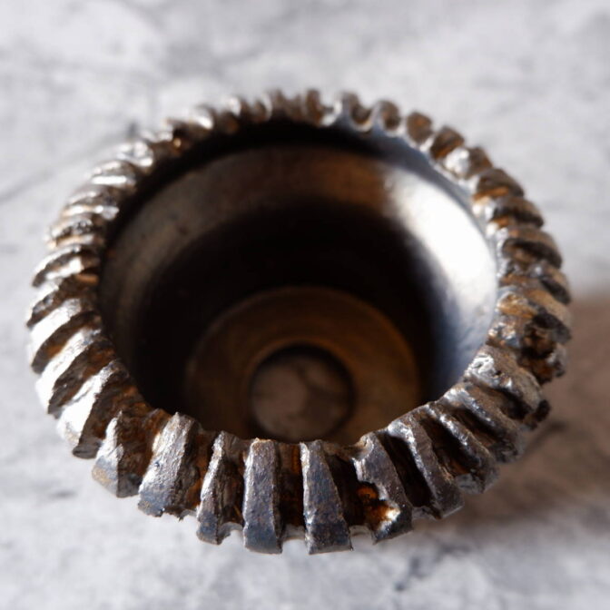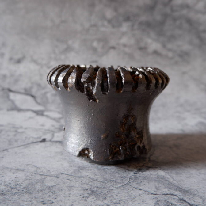 縁や溝など釉薬が溜まって濃く掛かった部分はブロンズ色が明るく発色していますが、全体的には光沢を抑えた少しメタリックな黒っぽいこげ茶、錆びた金属のような渋い発色です。