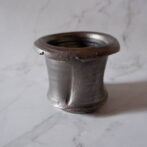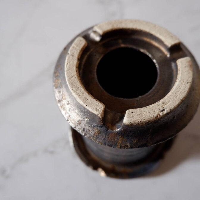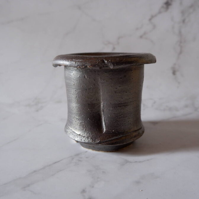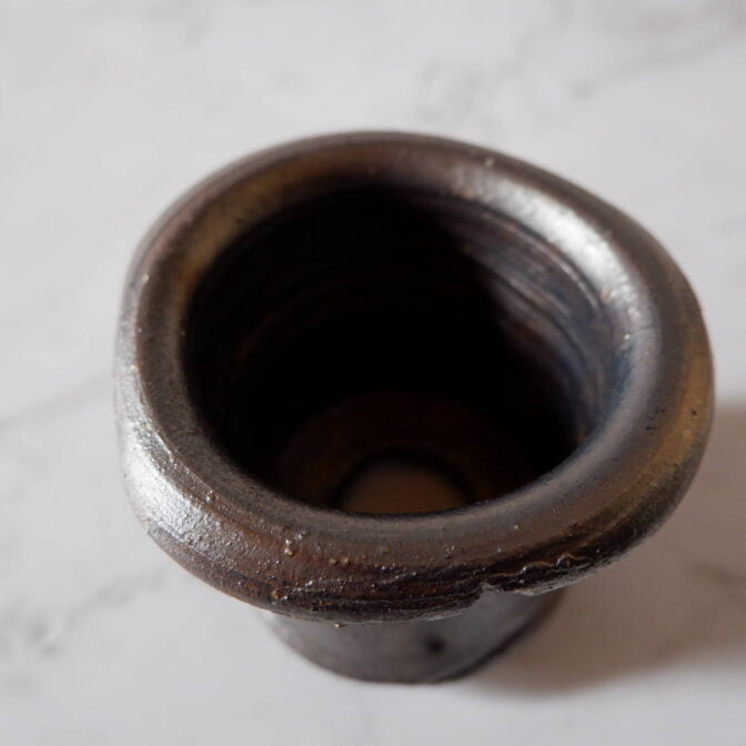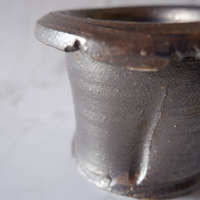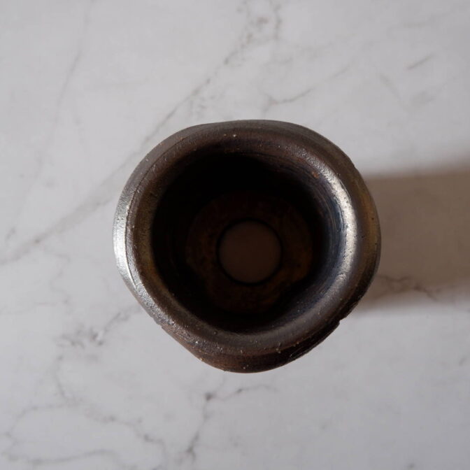 縁や溝など釉薬が溜まって濃く掛かった部分はブロンズ色が明るく発色していますが、全体的には光沢を抑えたメタリックな黒っぽいこげ茶、錆びた金属のような渋い発色です。