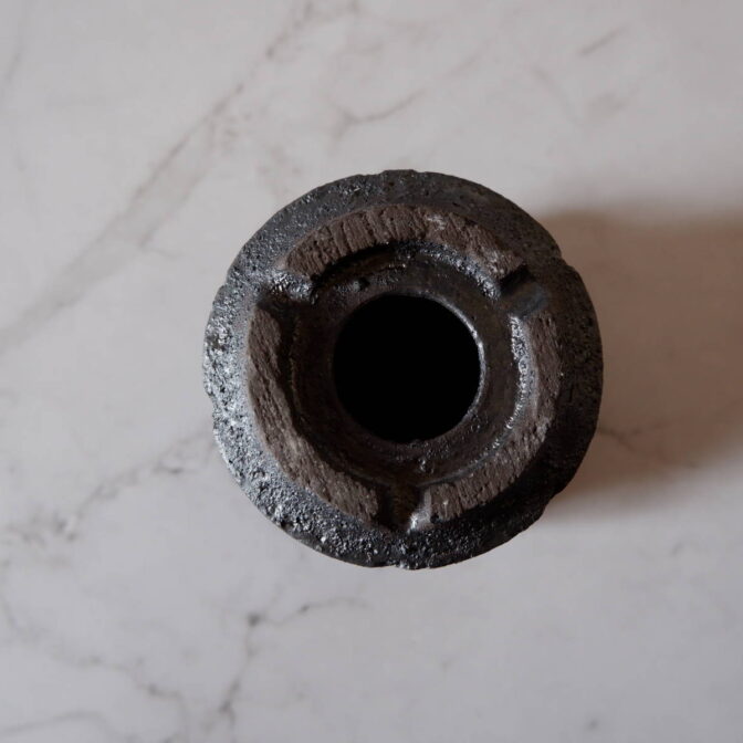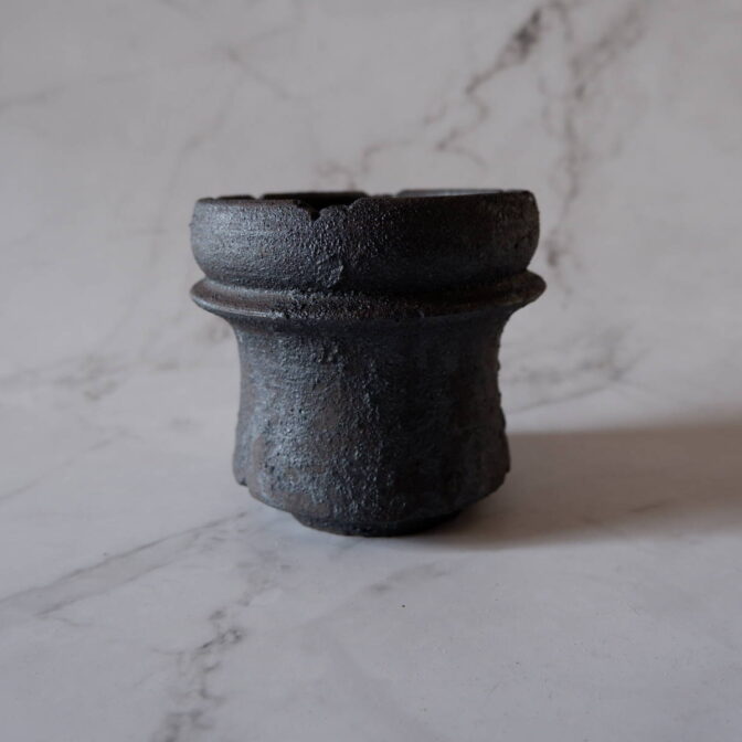 本作は、シンプルなフォルムの表面に土を塗り付け凸凹を作り、縁にクラックを加えました。