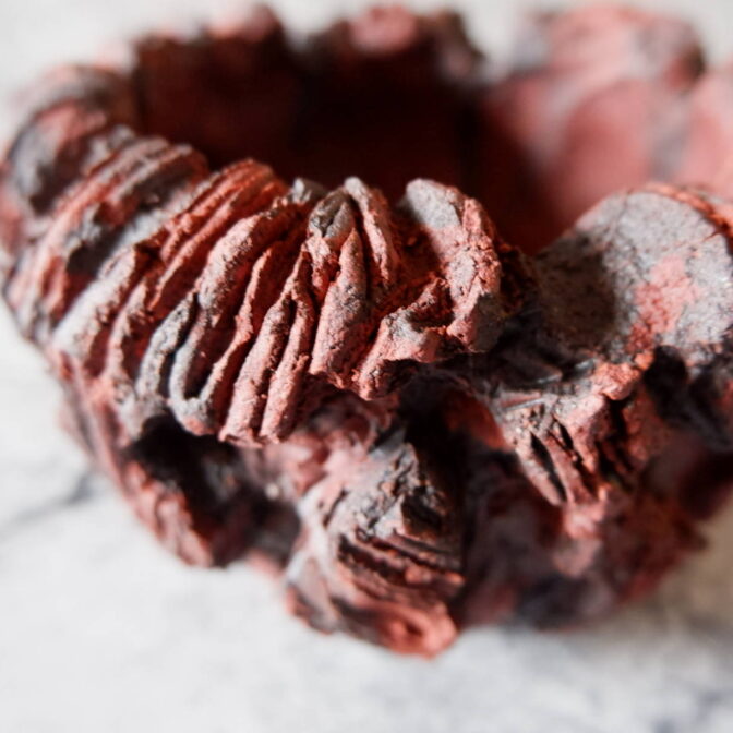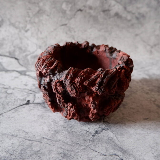 本作は、裂紋、ヒダ、深い彫りを組み合わせた、荒々しい表情の手捻りの鉢です。