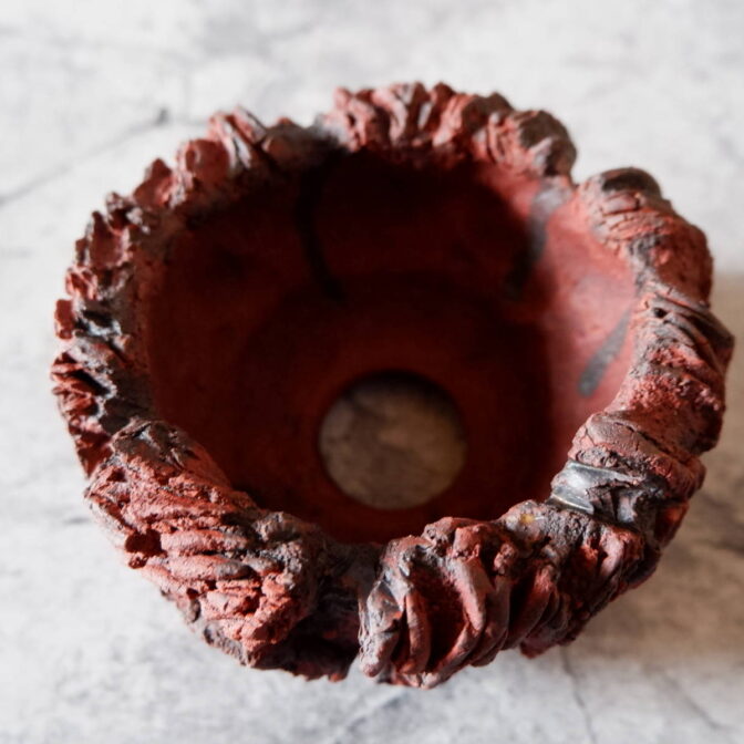- 木のような炭のようなゴツゴツとした模様が力強く、色も素敵でした。 適度に厚みがあるのと、底穴がいくつか空いていて水捌けが良さそうなところが◎です。