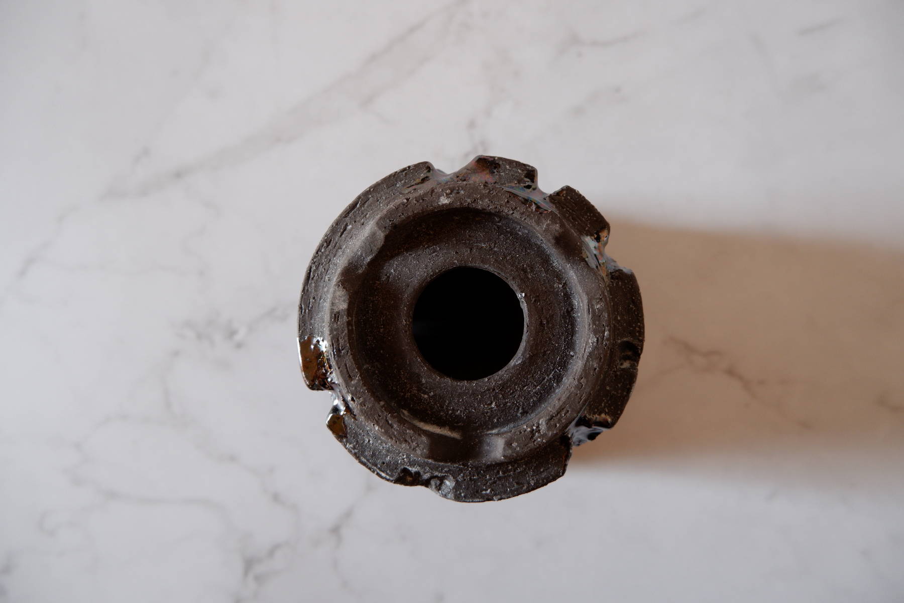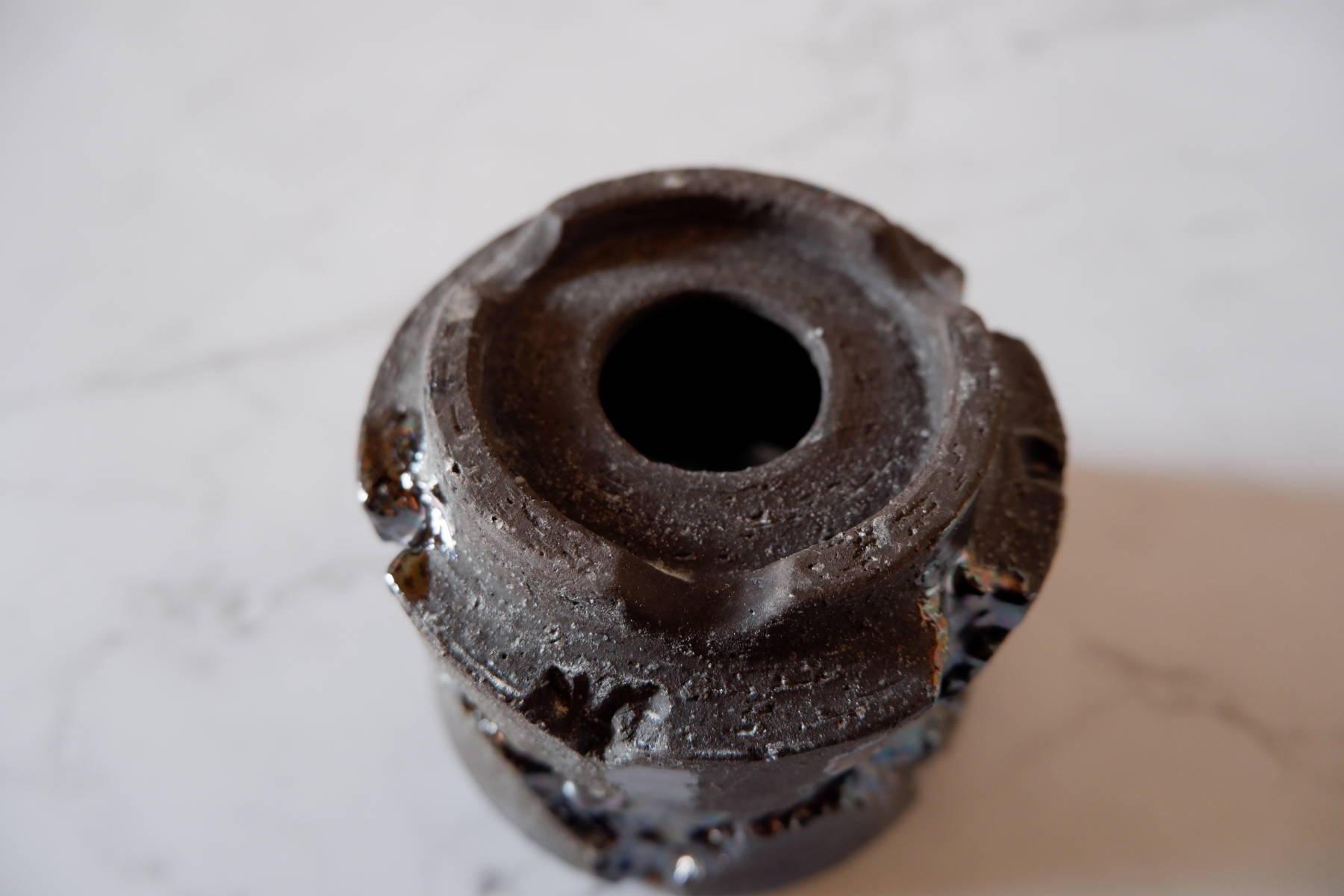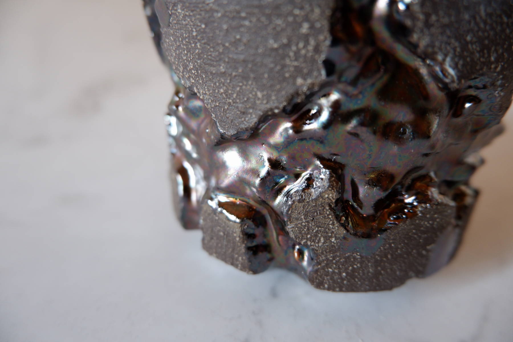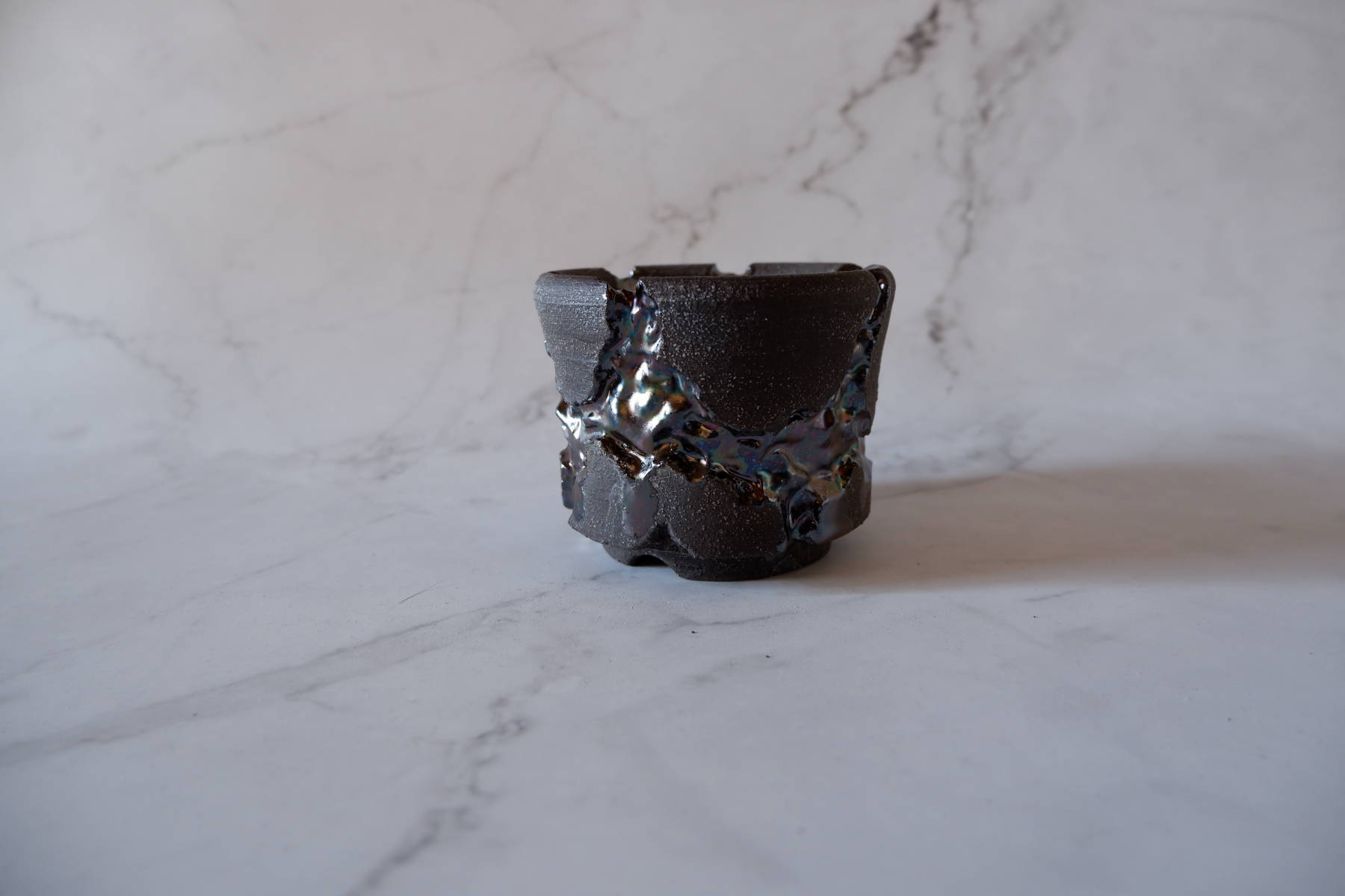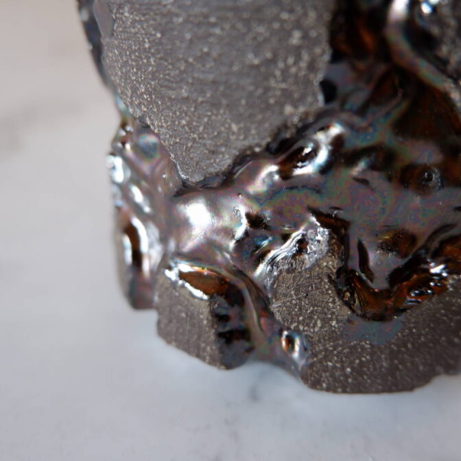 本作は、深く彫り込んだ部分に虹色のような光沢のある鉢です。