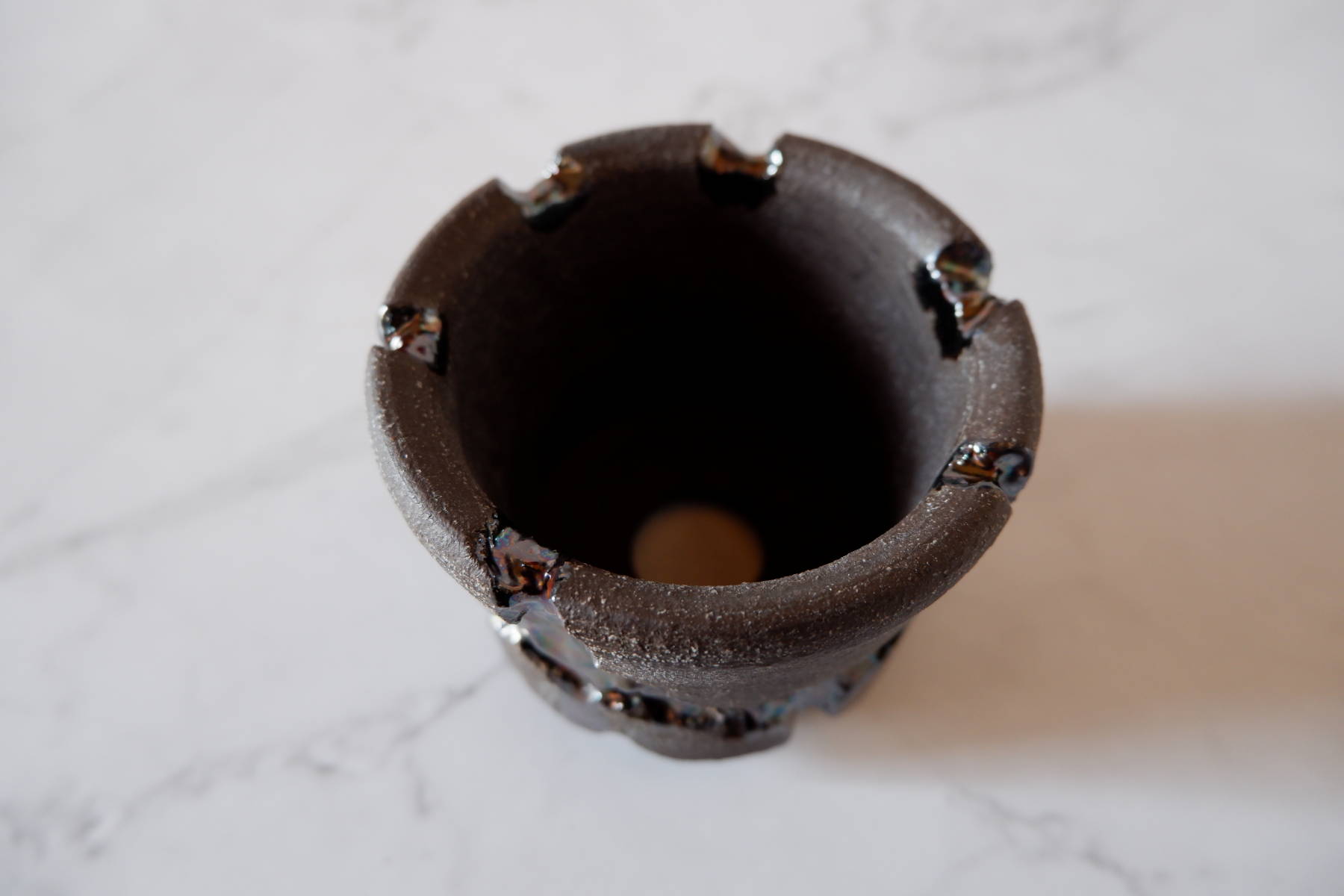 - 木のような炭のようなゴツゴツとした模様が力強く、色も素敵でした。 適度に厚みがあるのと、底穴がいくつか空いていて水捌けが良さそうなところが◎です。