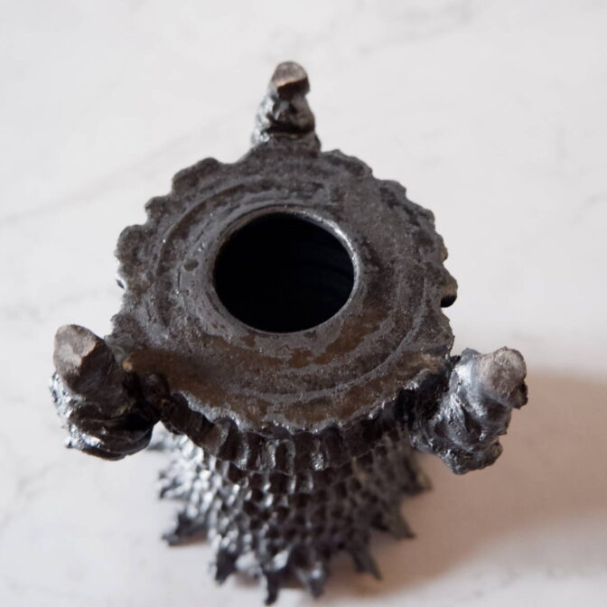 本作は、側面に流れのある彫りを施し、縁は「鬼鉢」のような尖った土を纏わせた三脚の鉢です。