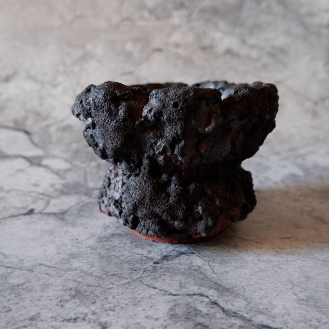 全体を艶のない極薄の釉薬で覆い、部分的に薄い黒い釉薬や小さい気泡が現われる釉薬を重ねましたので、野趣あふれる表情を見せています。