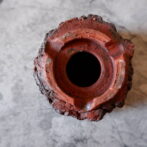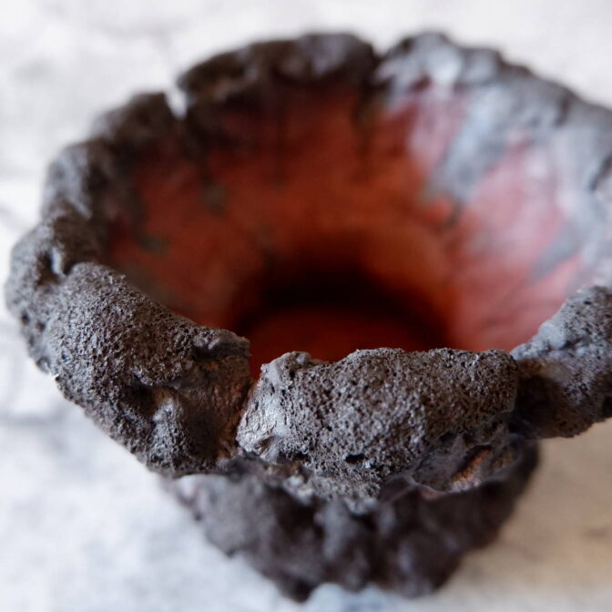 本作は、赤土に植木鉢の化粧砂などに用いる富士砂(富士山火山灰の粒)を土に練り込んだ手捻りの鉢です。