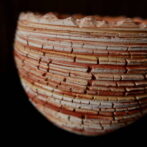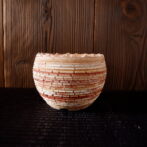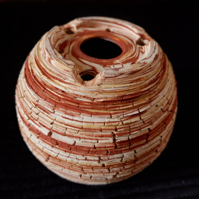 本作は、白、赤、黄の土を三層に錬り込んだ素地に、ひび割れ模様の裂紋(嘯裂文:しょうれつもん)を施しました。