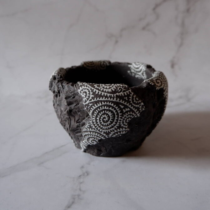 - 木のような炭のようなゴツゴツとした模様が力強く、色も素敵でした。 適度に厚みがあるのと、底穴がいくつか空いていて水捌けが良さそうなところが◎です。