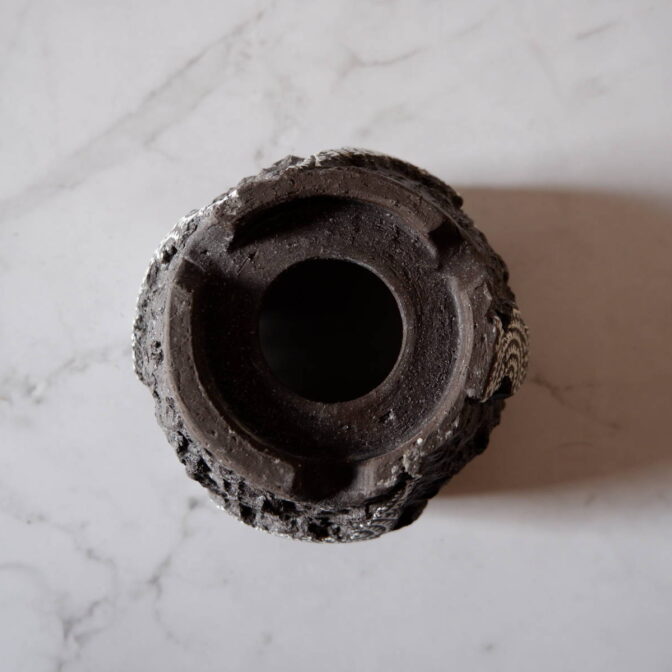 全体を光沢のない極薄の透明釉で仕上げており、表面はザラっとして、黒土の部分は真っ黒より少しグレーがかった発色です。