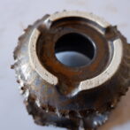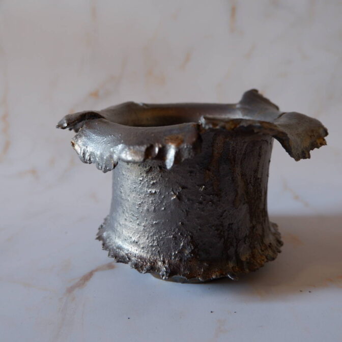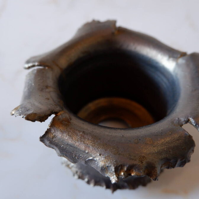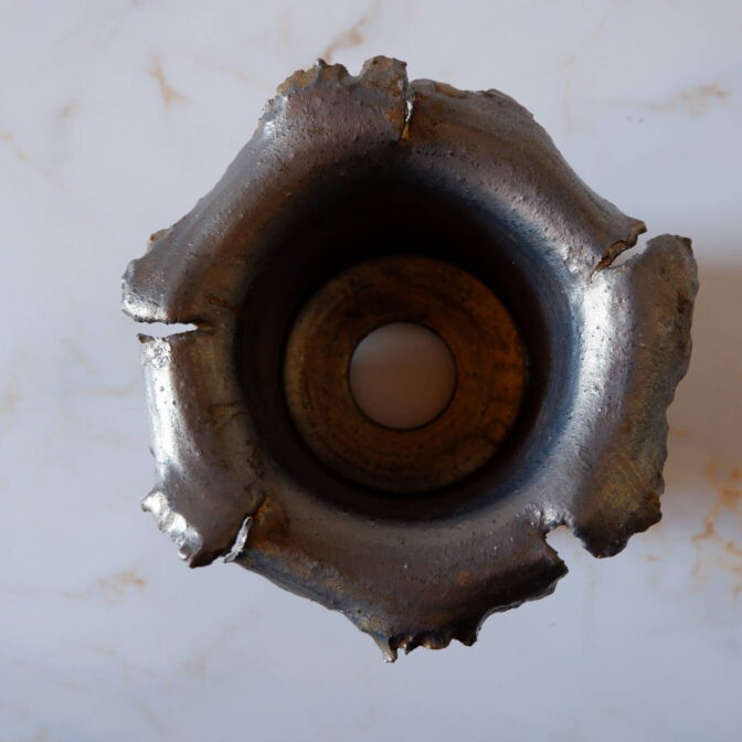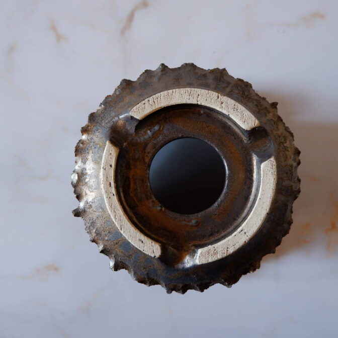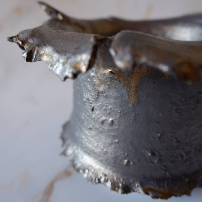 縁や溝など釉薬が溜まって濃く掛かった部分はブロンズ色が明るく発色していますが、全体的には光沢を抑えたメタリックな黒っぽいこげ茶、錆びた金属のような渋い発色です。