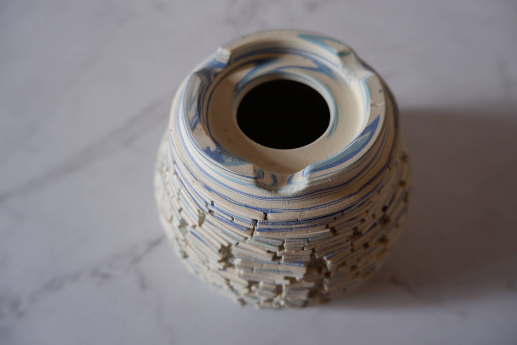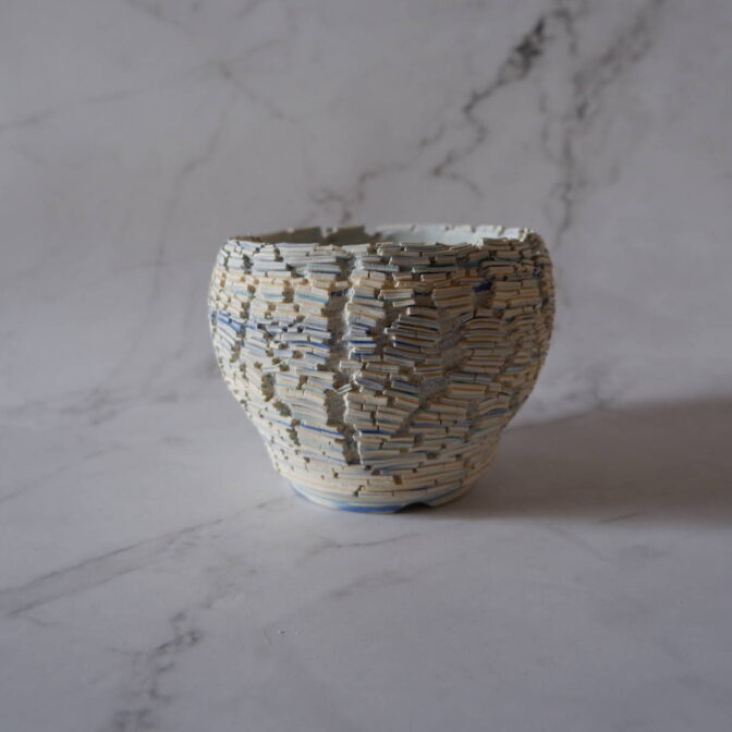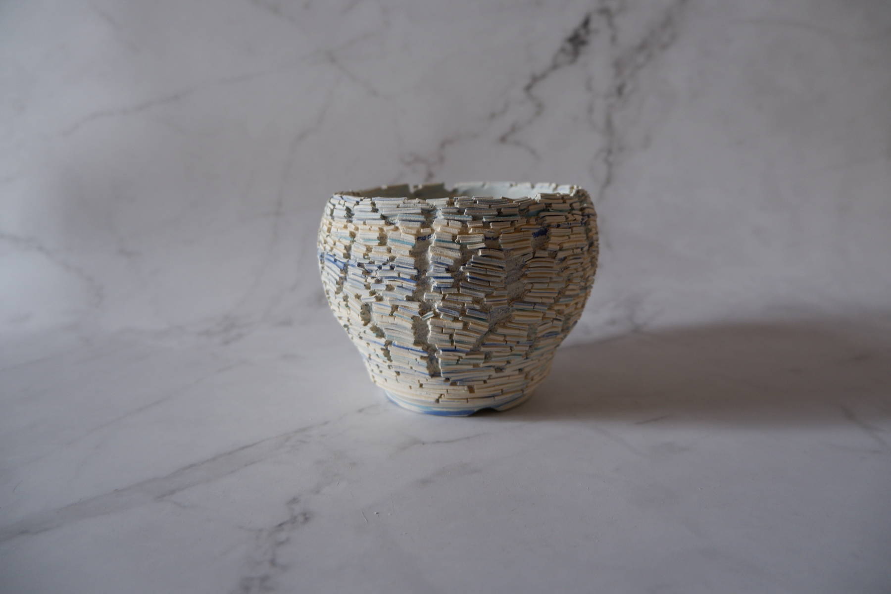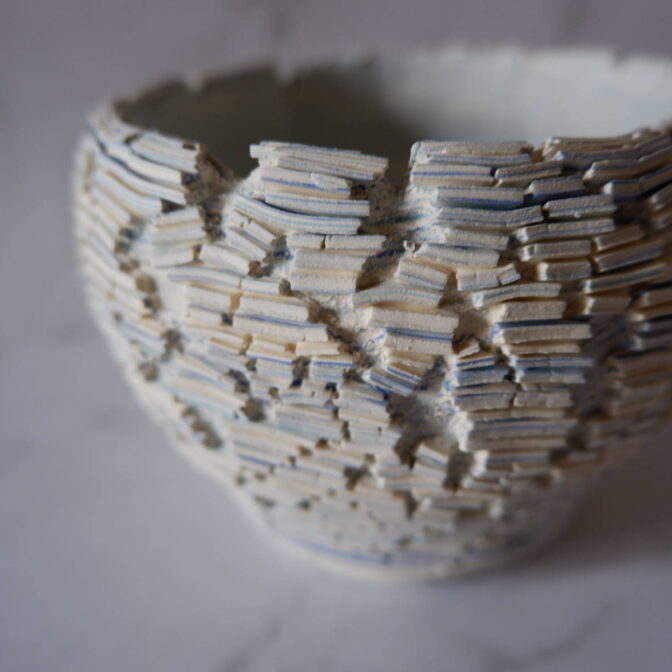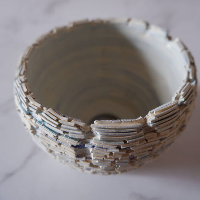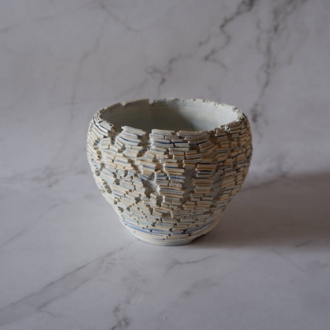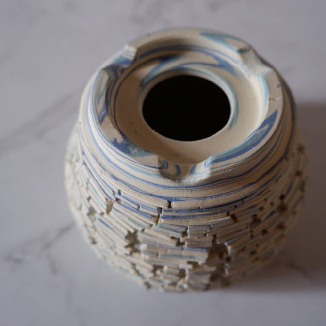 本作は、白土と2種類の青土を練り込んで、ひび割れ模様の裂紋(嘯裂文:しょうれつもん)を施しました。