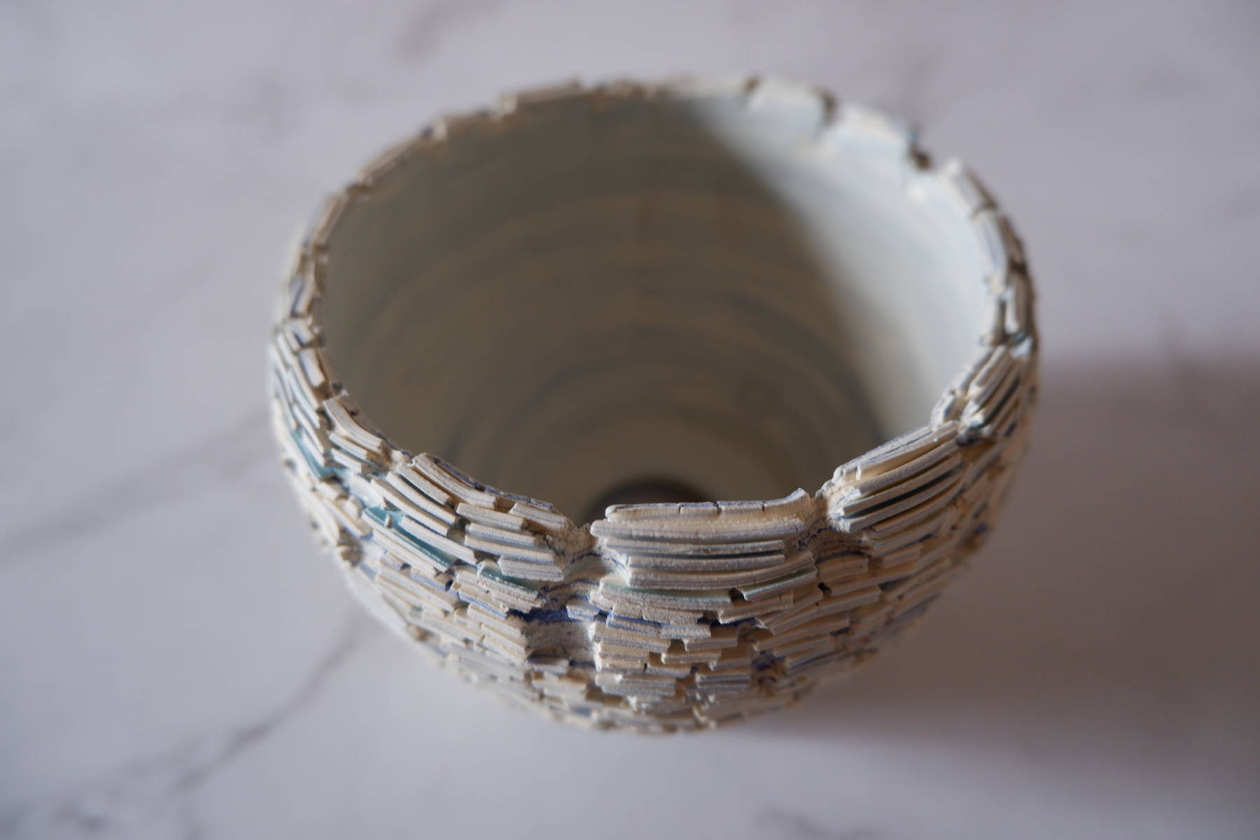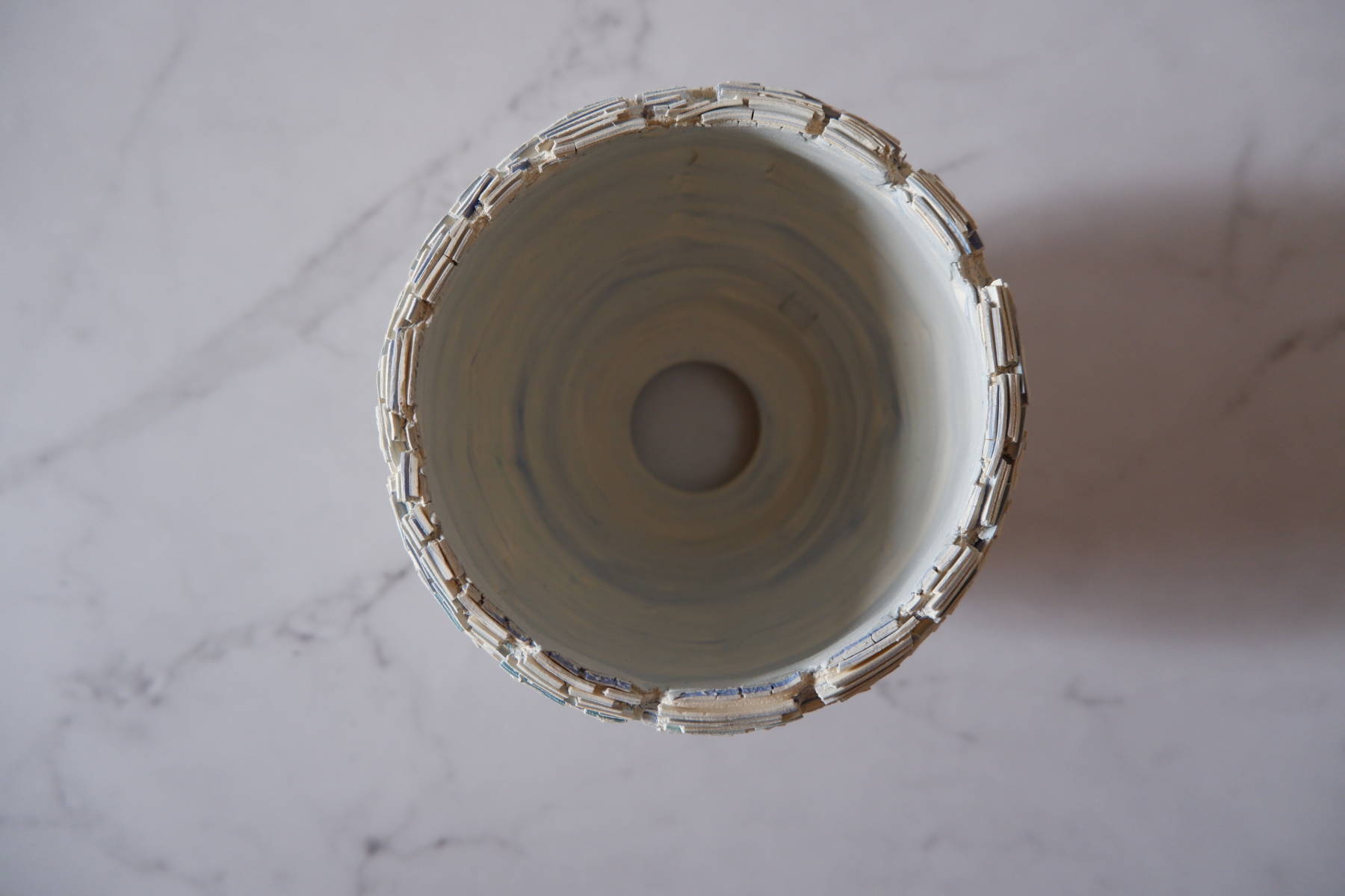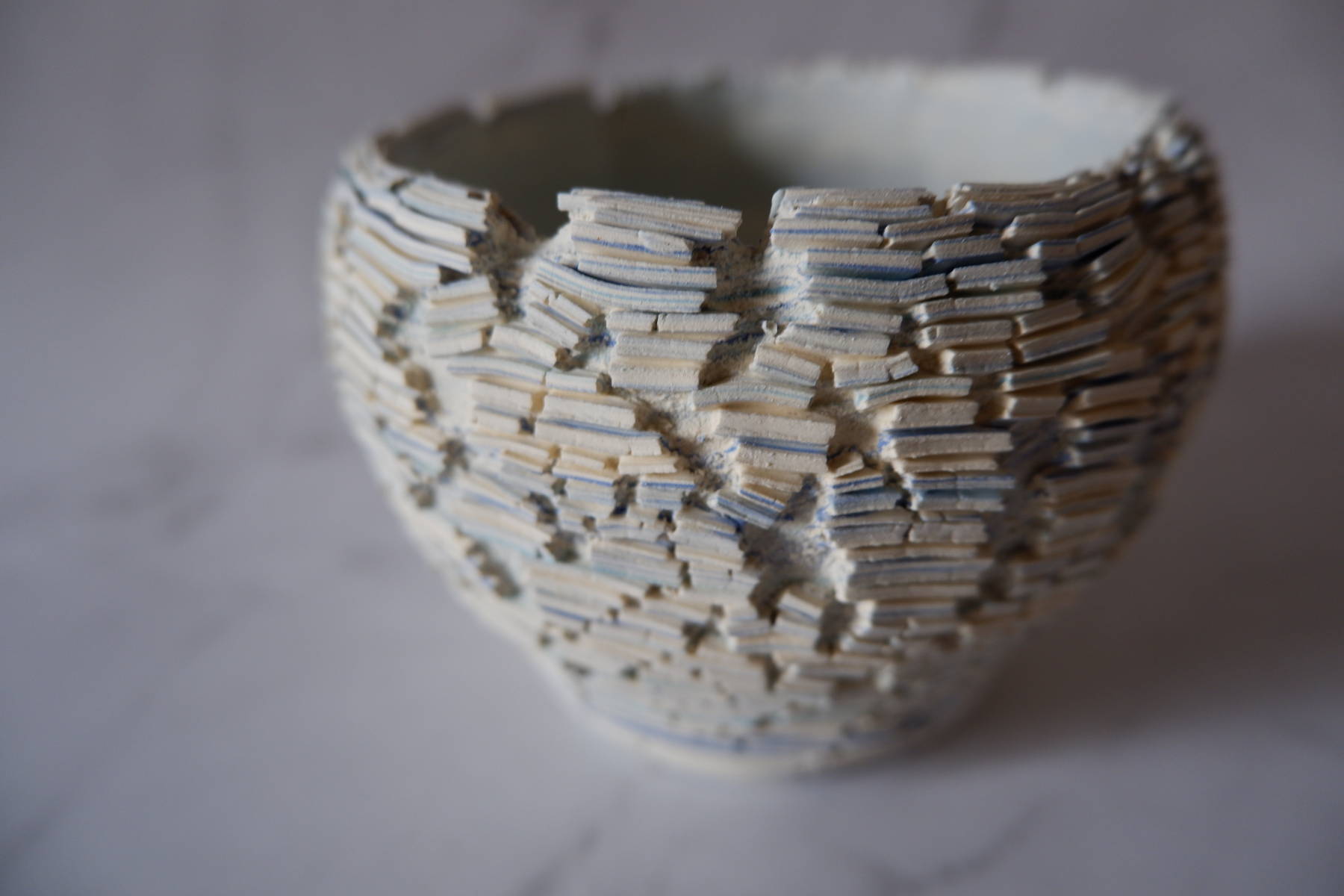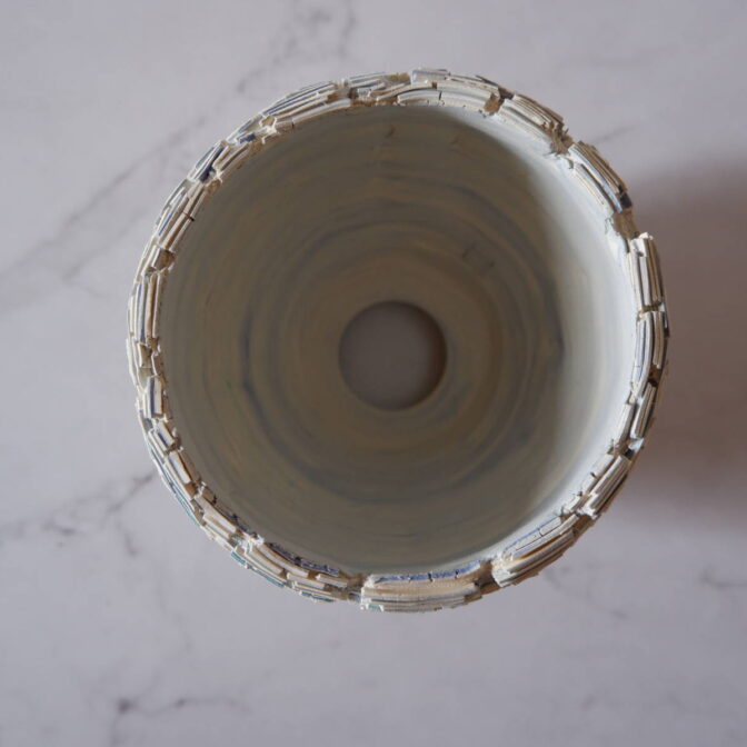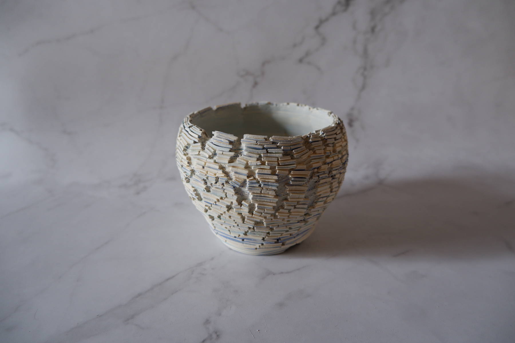 本作は、白土と2種類の青土を練り込んで、ひび割れ模様の裂紋(嘯裂文:しょうれつもん)を施しました。