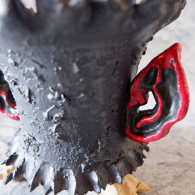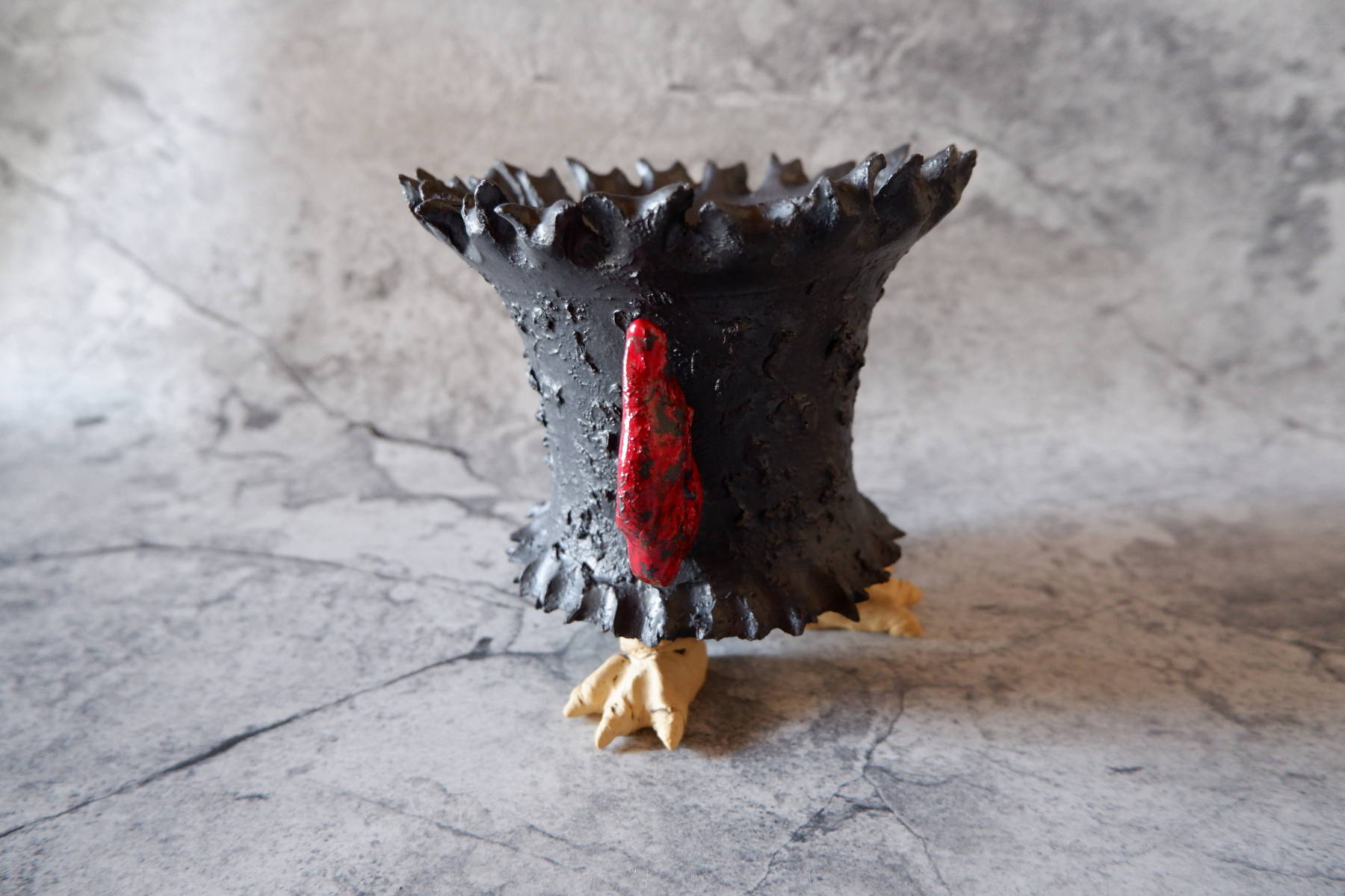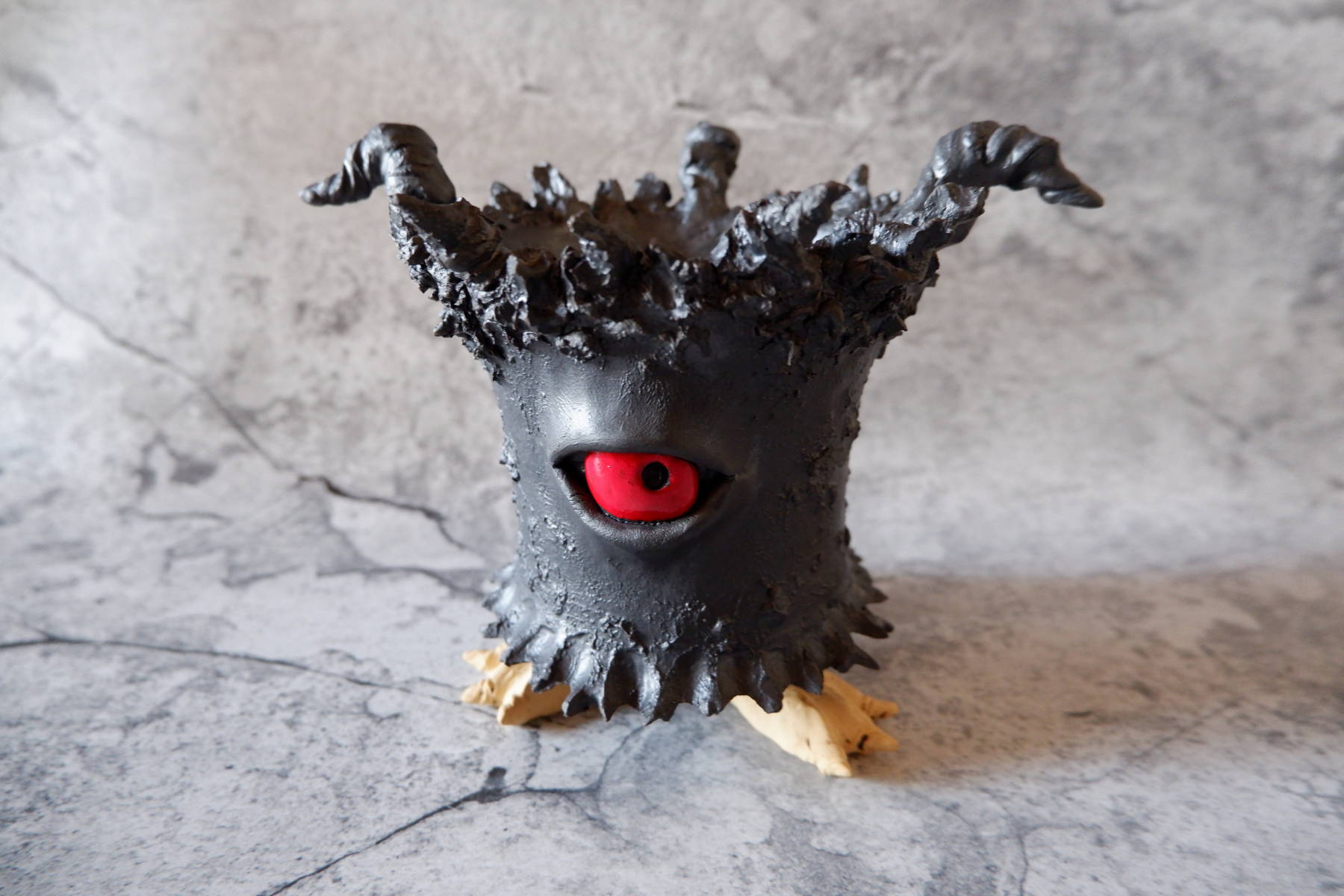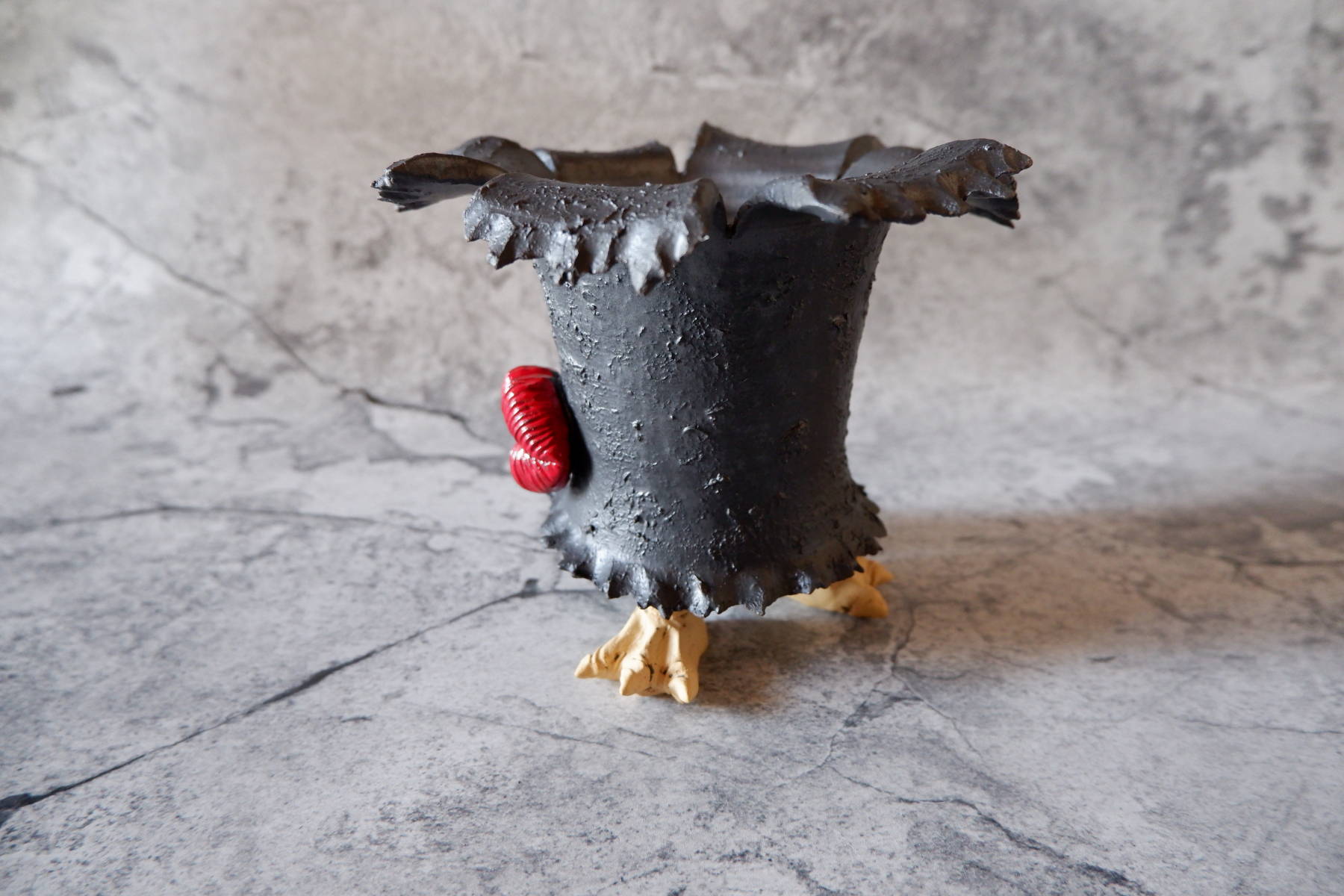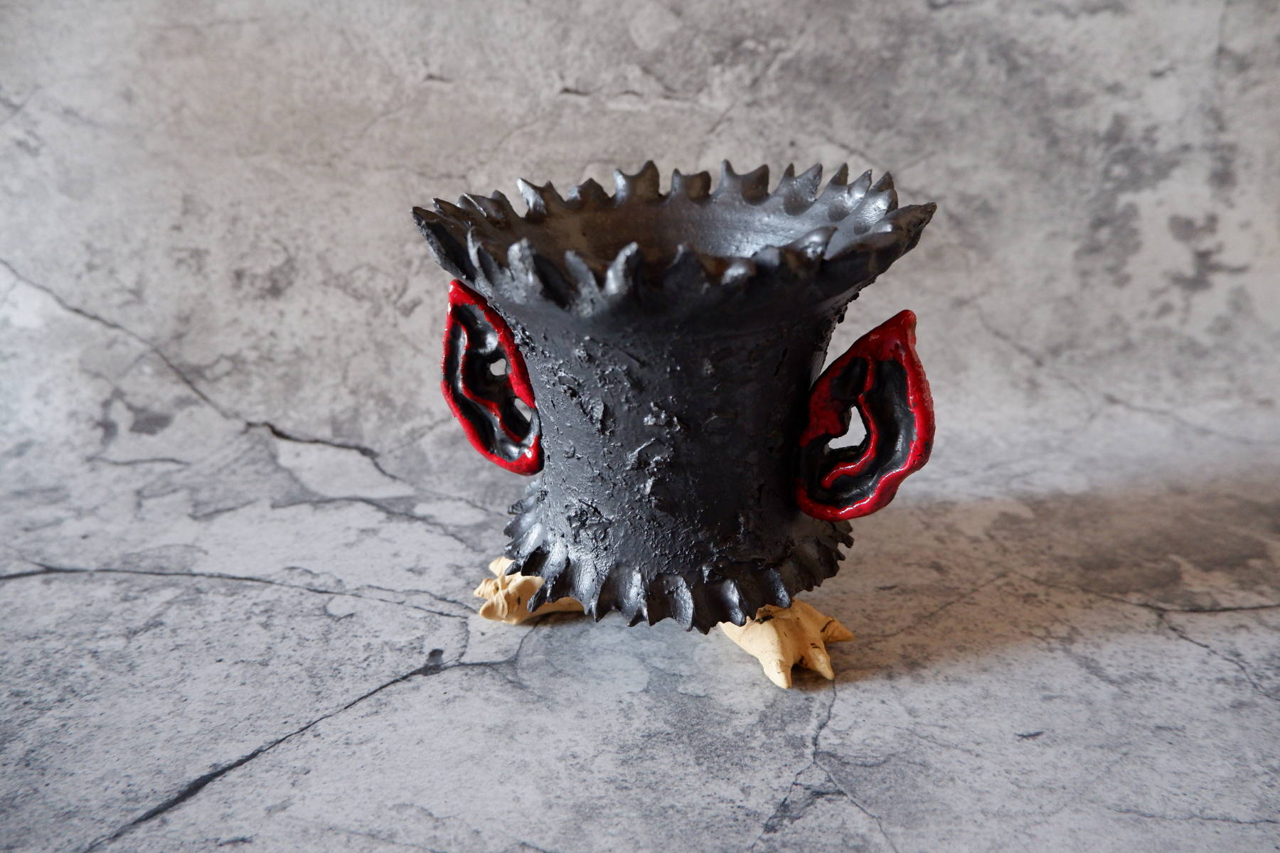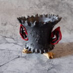 艶の無いマットな黒いボディに真っ赤な目、口、耳を持たせた三本脚の鉢です。