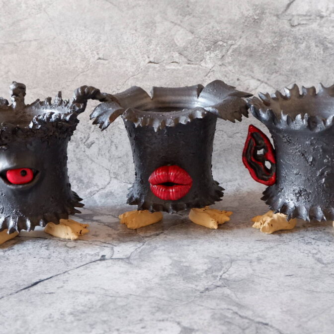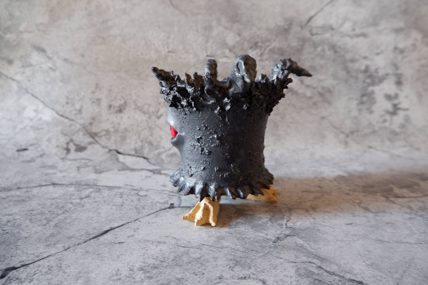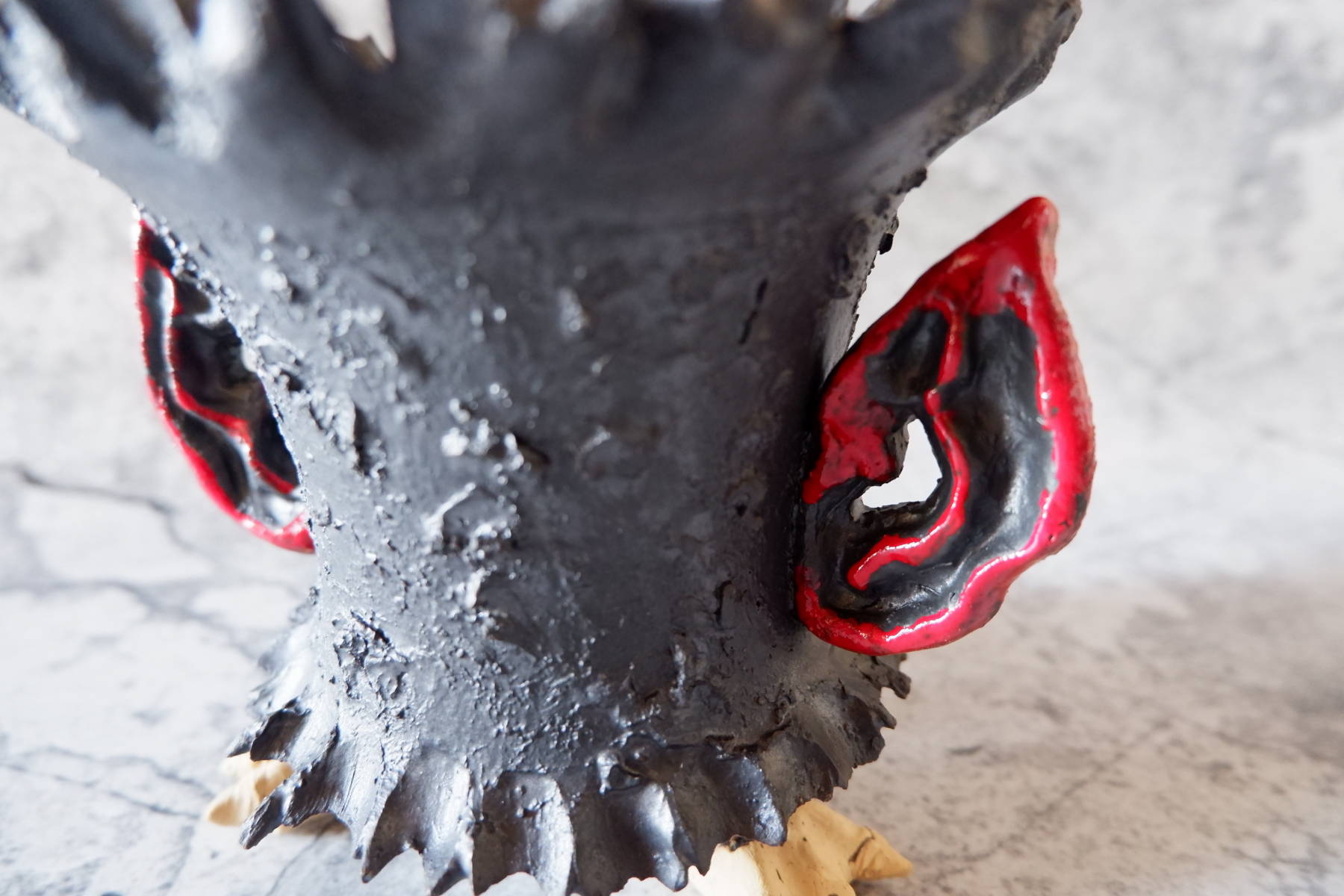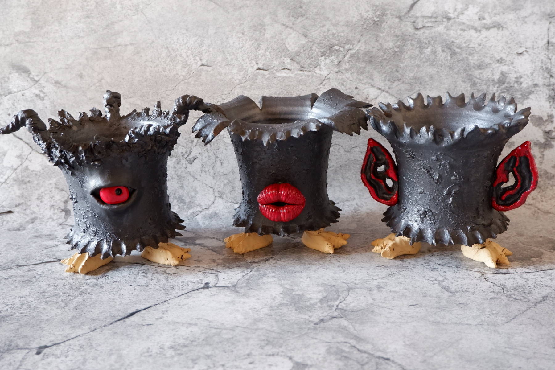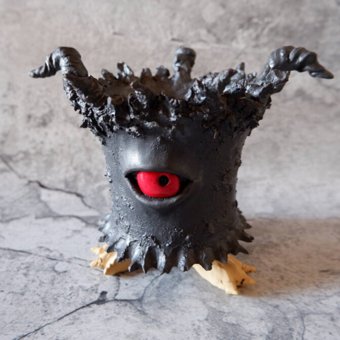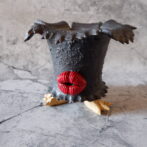 艶の無いマットな黒いボディに真っ赤な目、口、耳を持たせた三本脚の鉢です。