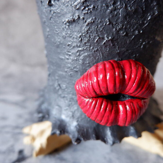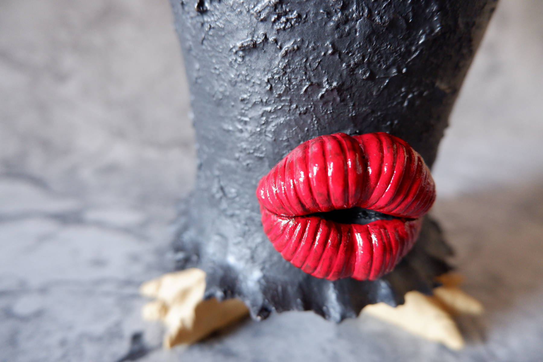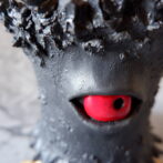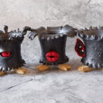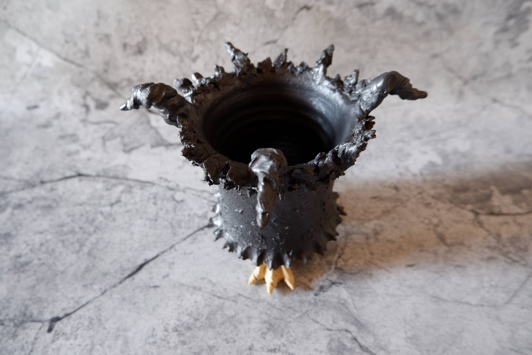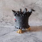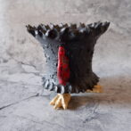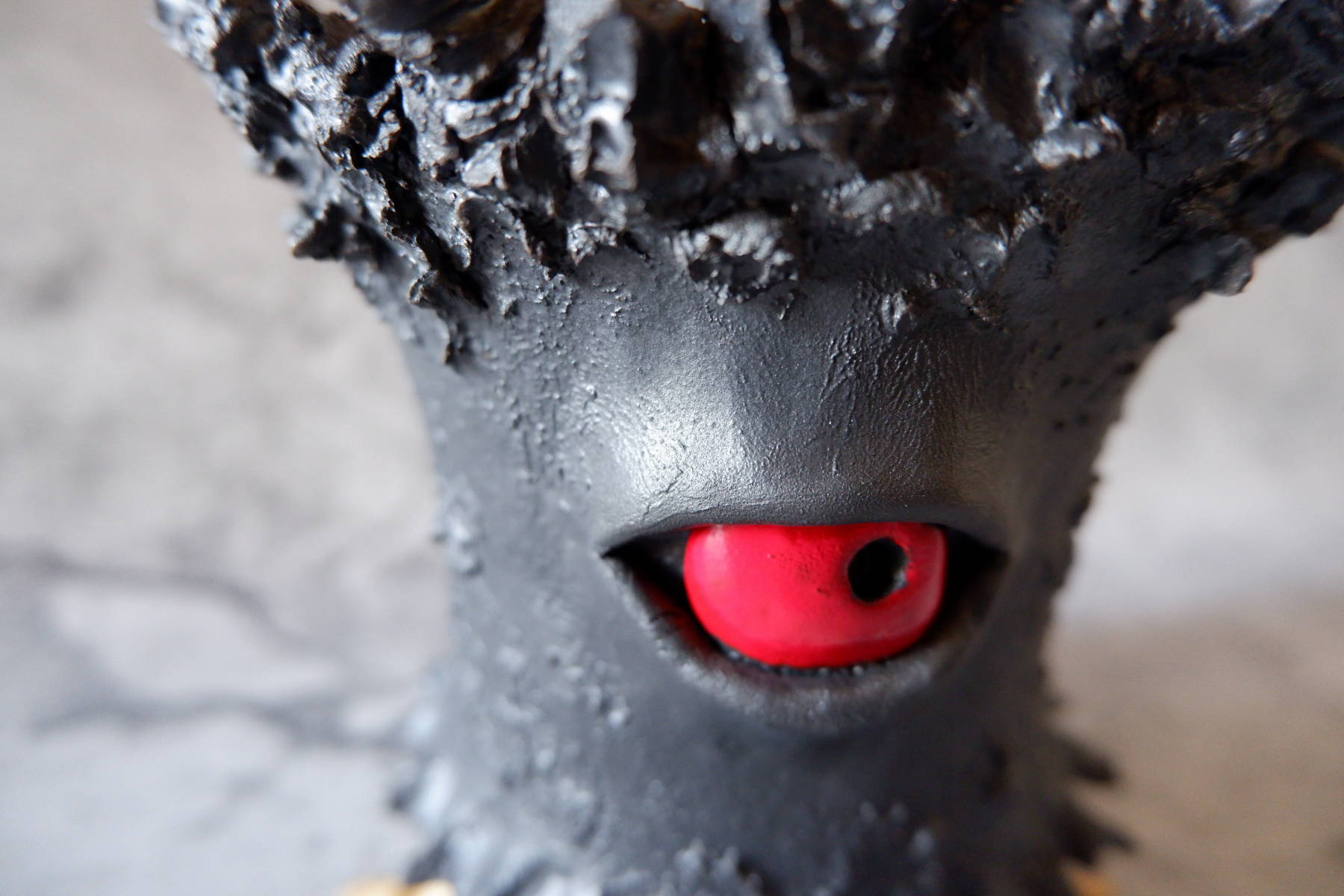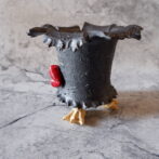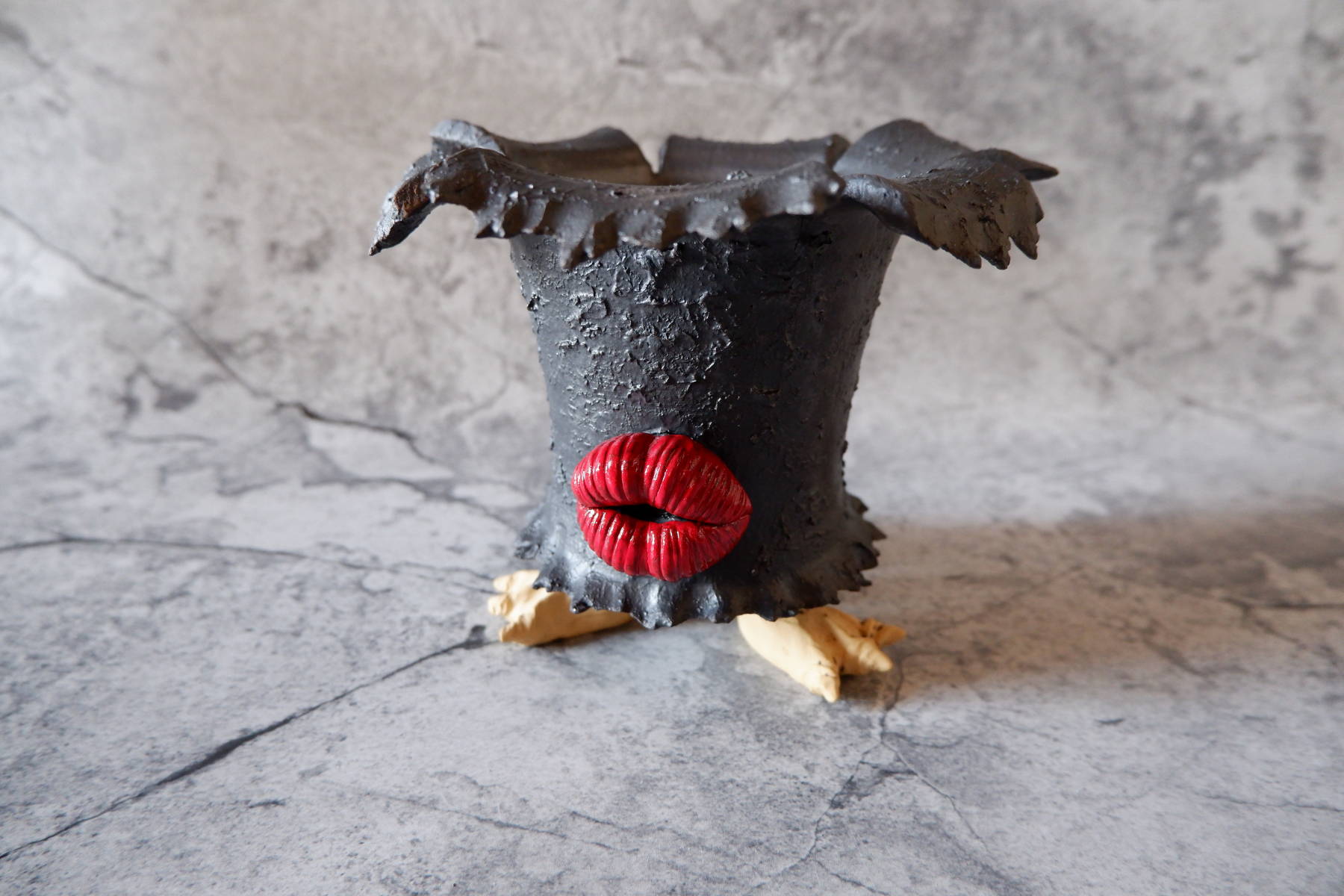 艶の無いマットな黒いボディに真っ赤な目、口、耳を持たせた三本脚の鉢です。