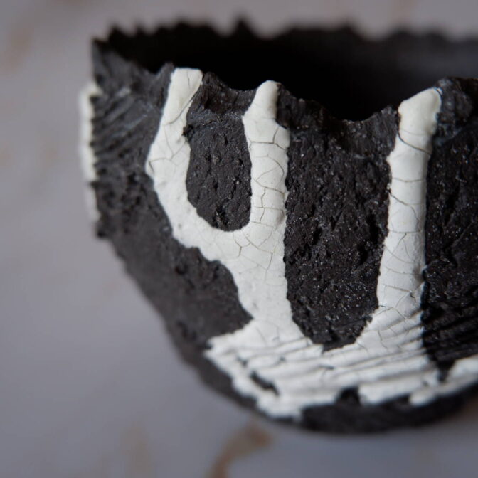 本作は、捻りを加えた裂紋(ひび割れ模様)を施した表面に、貫入が出る白い化粧土を流し掛けました。