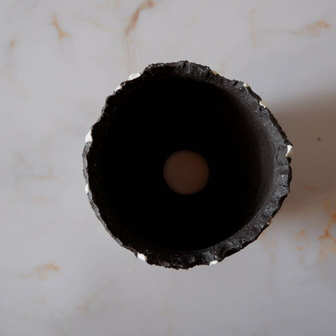 全体を光沢のない極薄の透明釉で仕上げており、表面はザラっとして、黒土の部分は真っ黒より少しグレーがかった発色です。