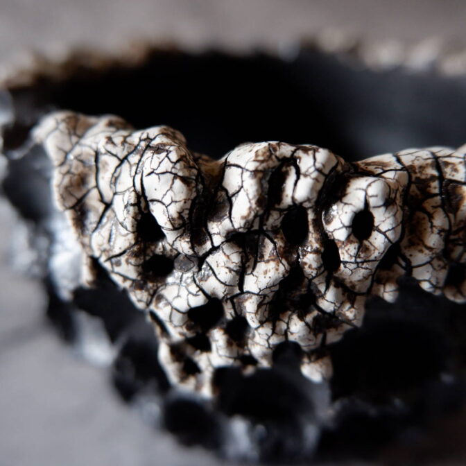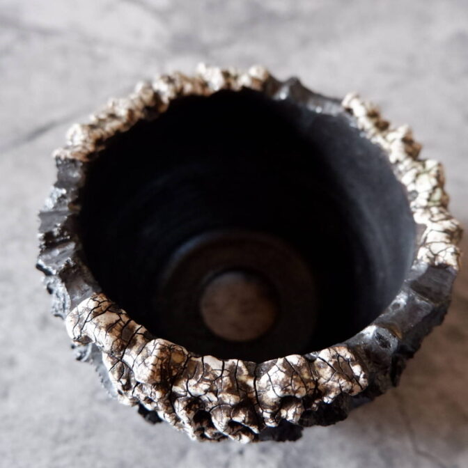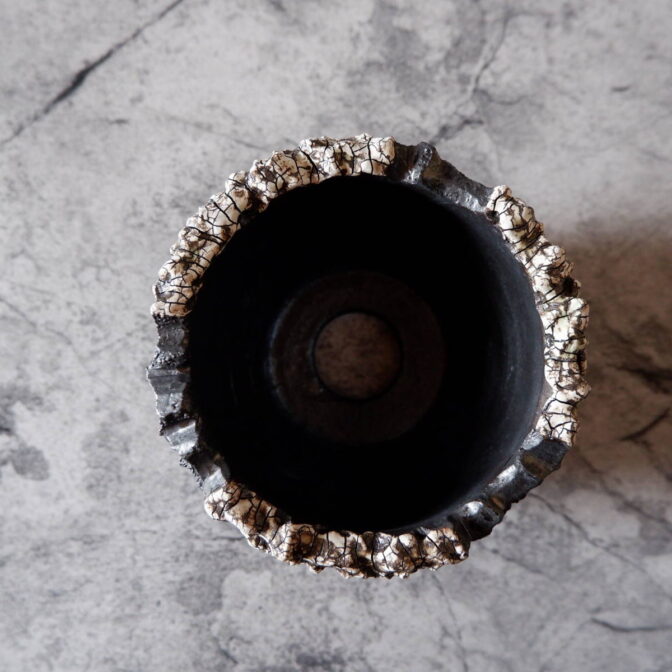 艶を抑えた黒釉を全体に掛け、白化粧土が顔を出すようその部分だけ一度拭き取り、更に上から透明釉を塗り重ねましたので、ひび割れ模様がより鮮明に現れています。