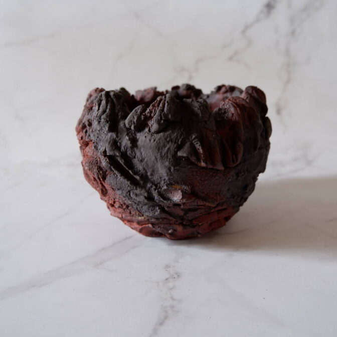 本作は、粗い岩肌のような荒々しい表情の手捻りの鉢です。