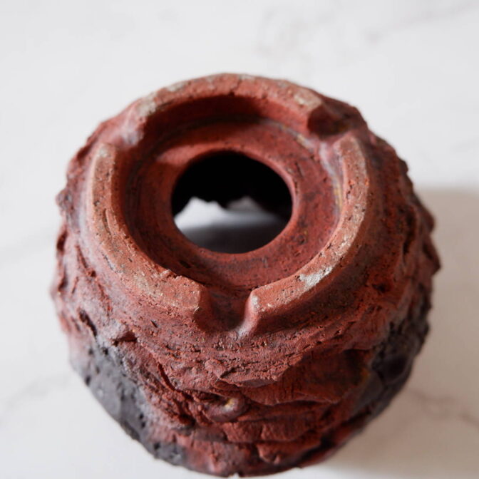 全体を極薄の釉薬で覆い、赤土の部分は濃いエビ茶色のような発色です。