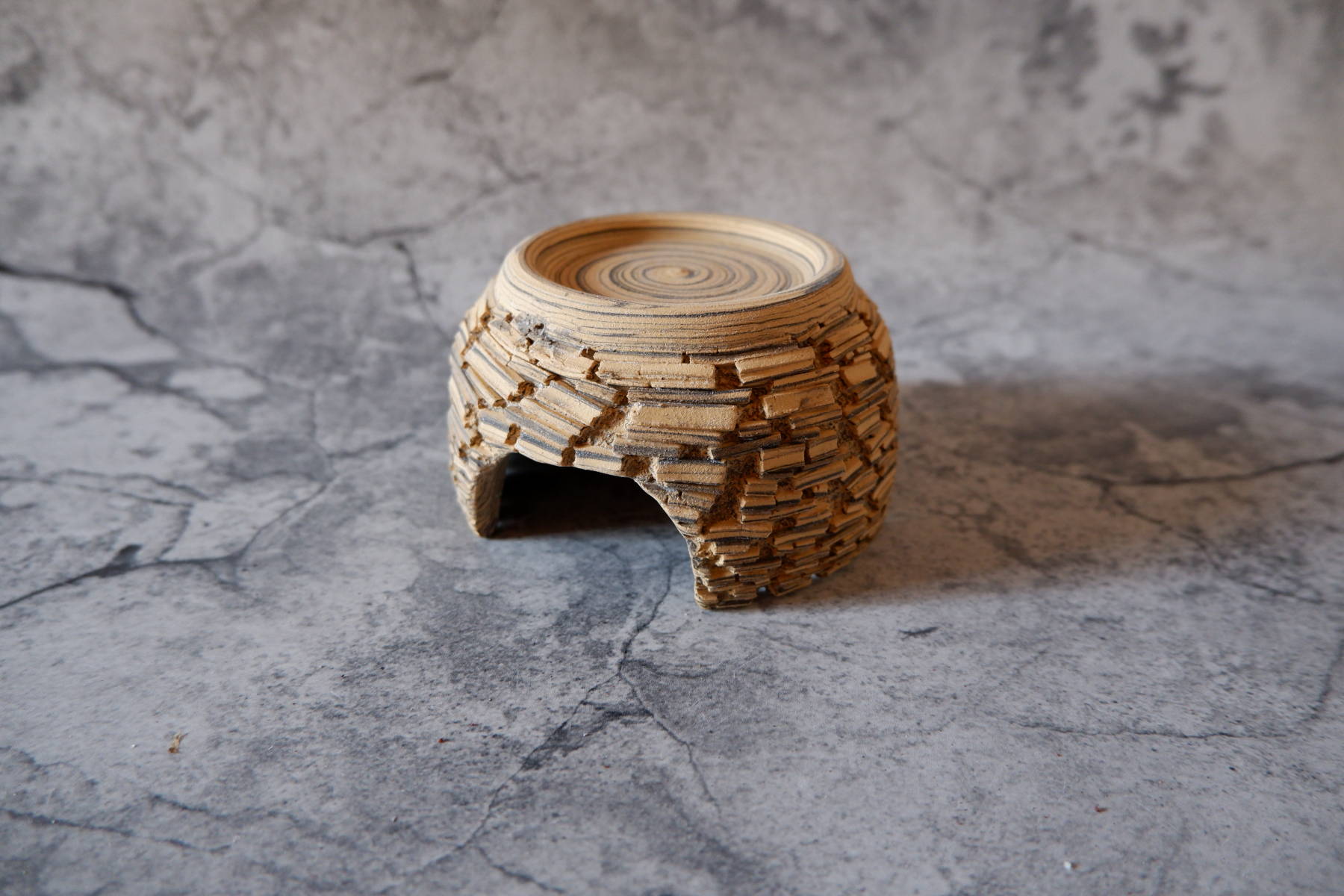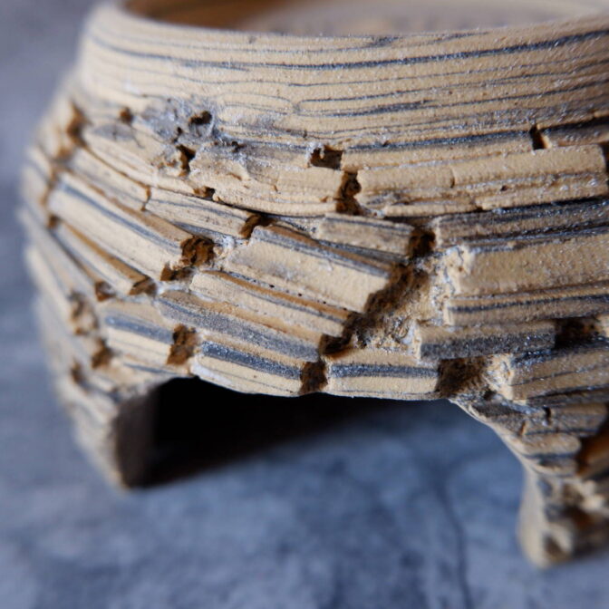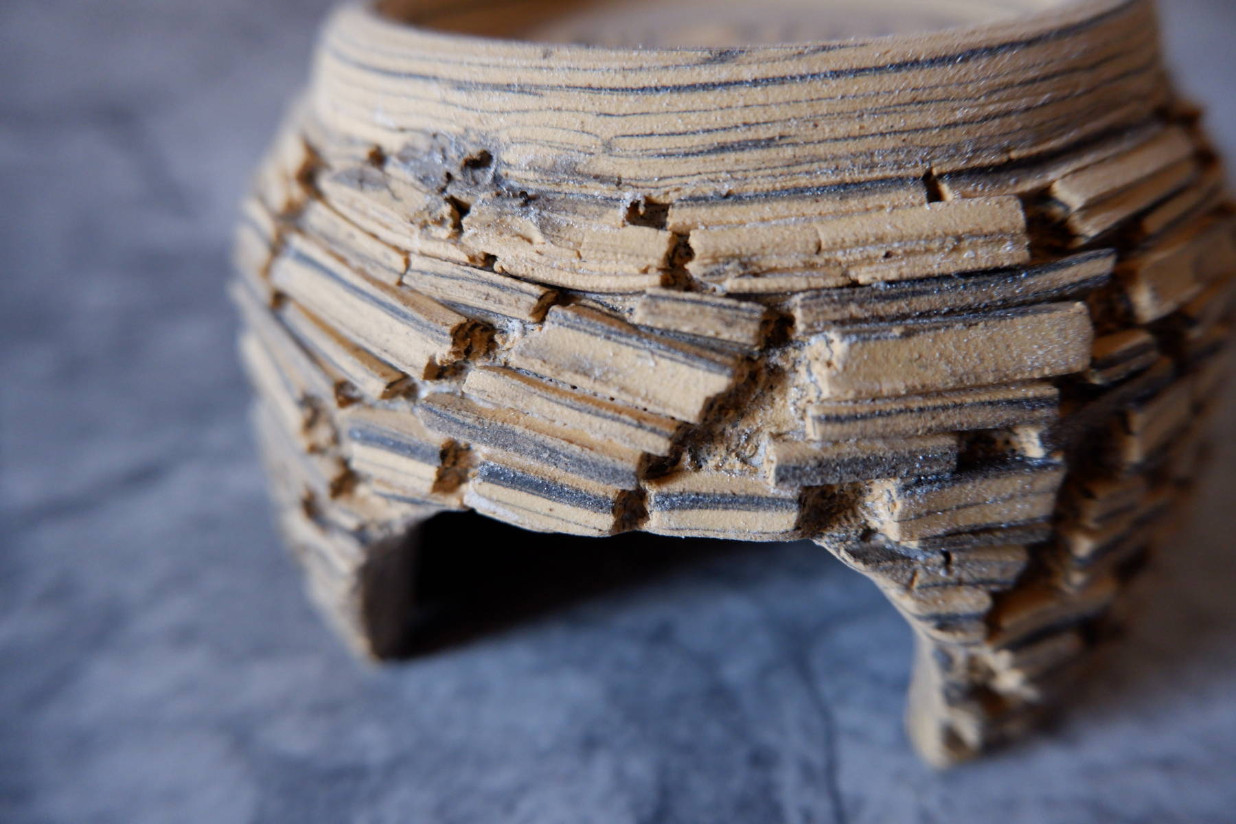 本作は、黄色と黒色の土を層状に練り合わせ、全体にひび割れ模様の裂紋(嘯裂文:しょうれつもん)を施した爬虫類等向けシェルターです。