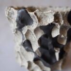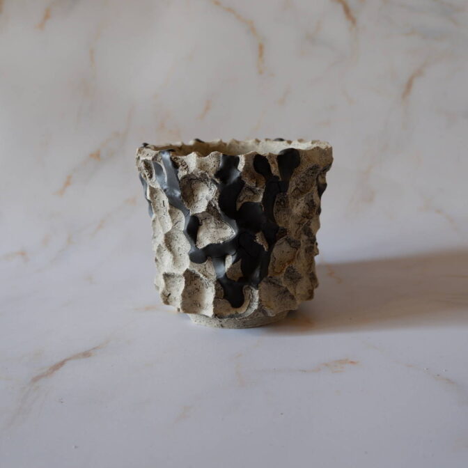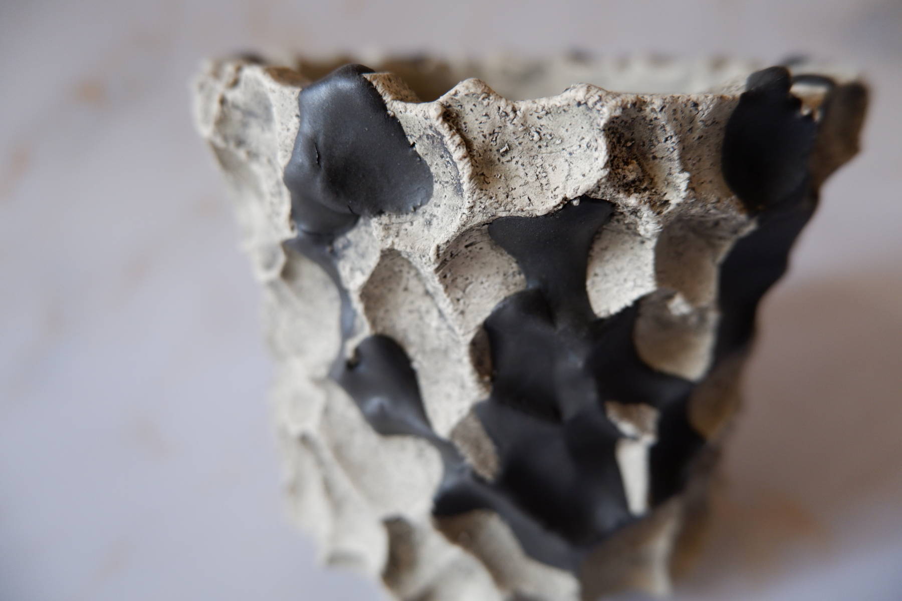 本作は、雲母などを練り込んだザラっとした質感の白い土に荒く深い彫りを施し、黒化粧土を部分掛けした上から薄墨のような黒釉で覆いました。