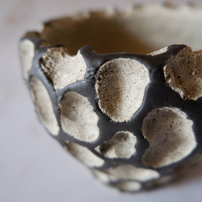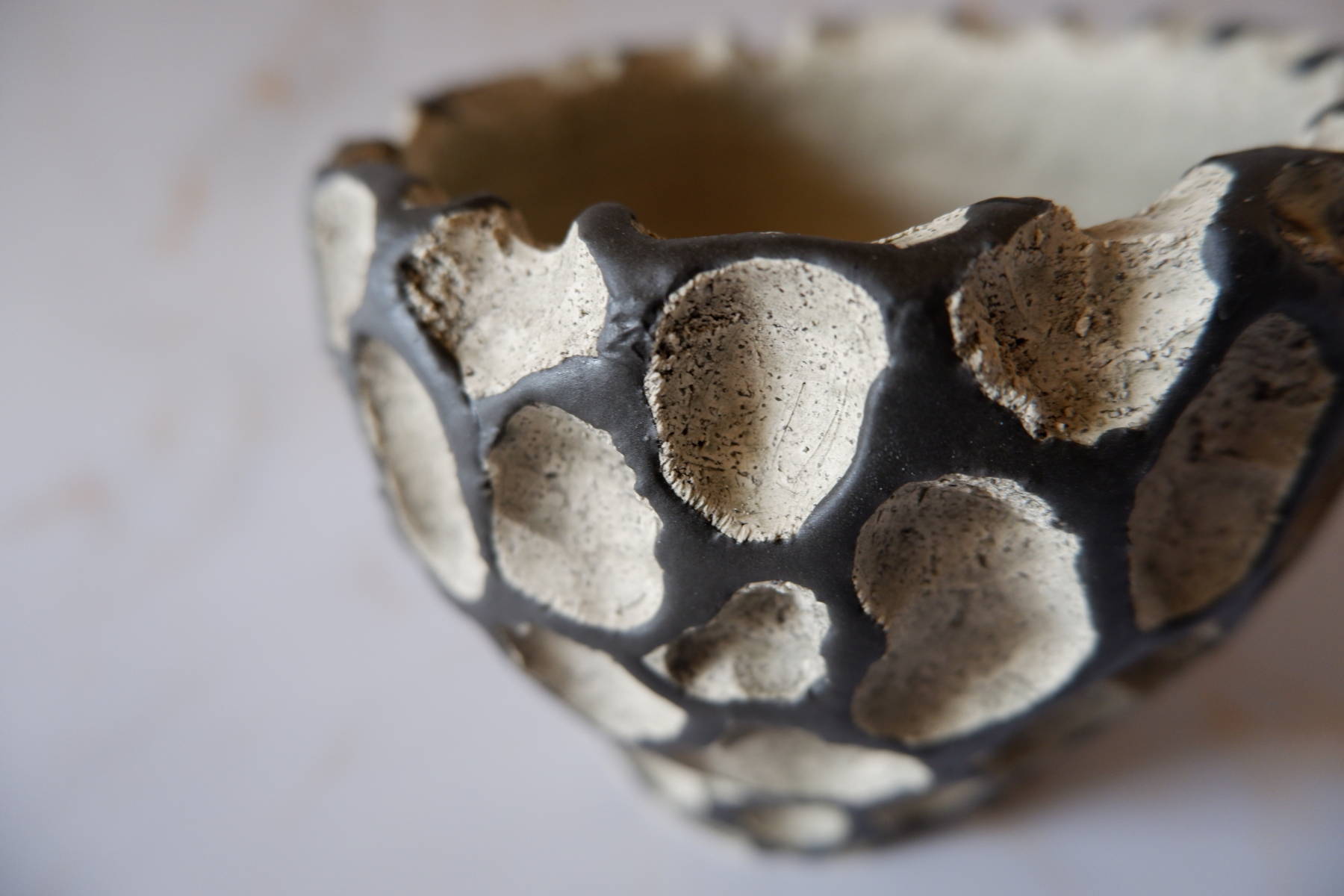 本作は、雲母などを練り込んだザラっとした質感の白い土に荒く深い彫りを施し、彫り残した縁に黒化粧土を手塗りした上から薄墨のような黒釉で覆いました。