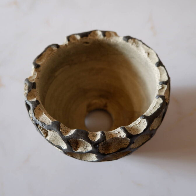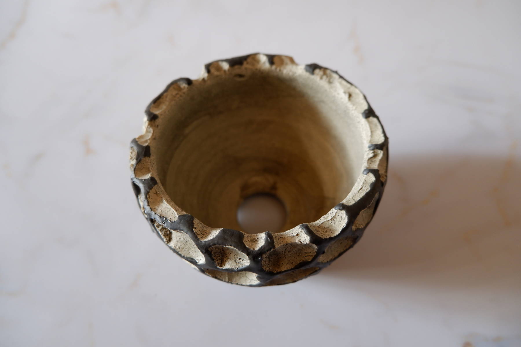 • 木のような炭のようなゴツゴツとした模様が力強く、色も素敵でした。 適度に厚みがあるのと、底穴がいくつか空いていて水捌けが良さそうなところが◎です。