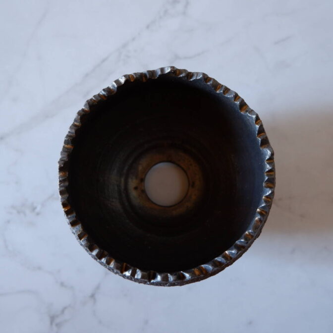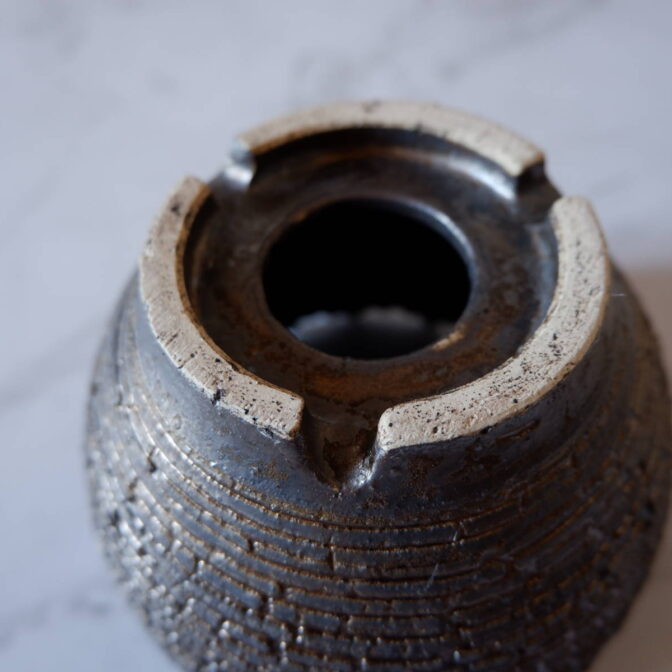 縁や溝など釉薬が溜まって濃く掛かった部分はブロンズ色が明るく発色していますが、全体的には光沢を抑えたメタリックな黒っぽいこげ茶、錆びた金属のような渋い発色です。