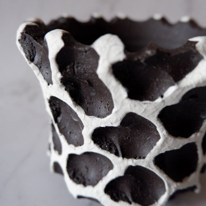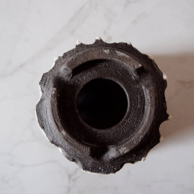 本作は、側面を荒く深く彫り込み、それぞれの縁にひび割れが生じる白化粧土を塗りました。