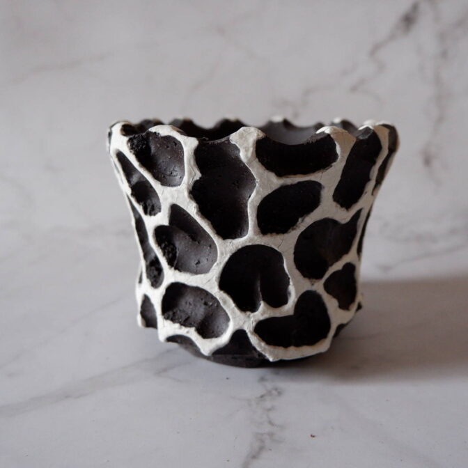 - 木のような炭のようなゴツゴツとした模様が力強く、色も素敵でした。 適度に厚みがあるのと、底穴がいくつか空いていて水捌けが良さそうなところが◎です。
