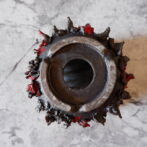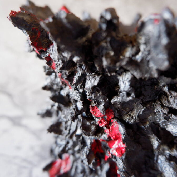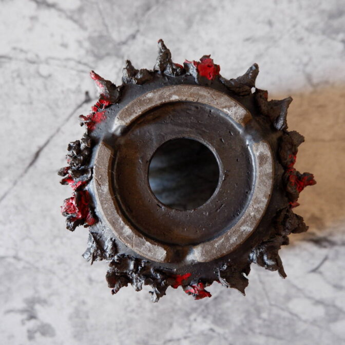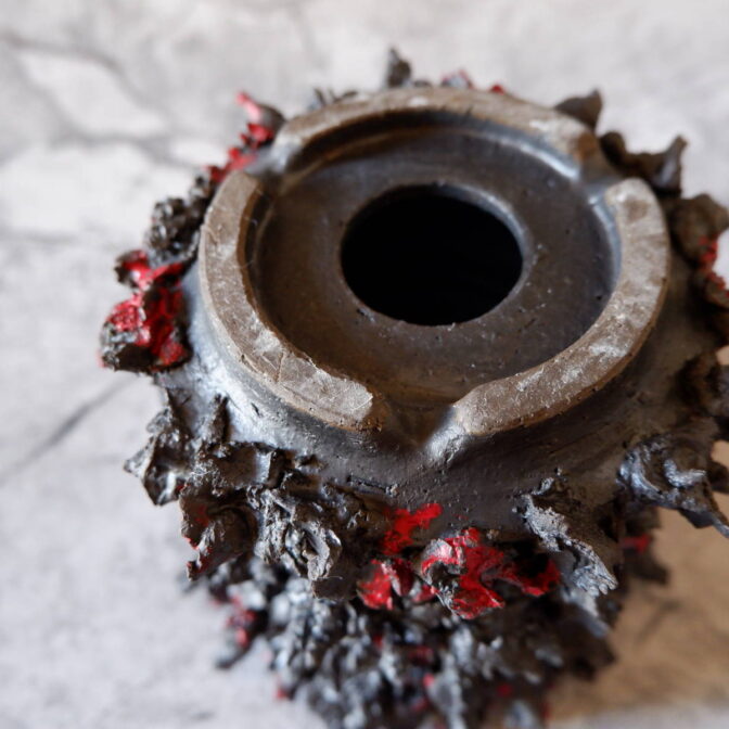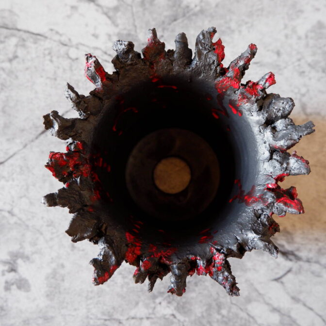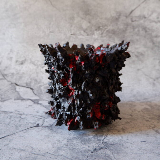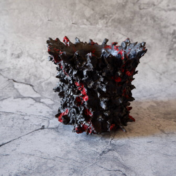 本作は、全体に土を荒々しく塗り付けました「鬼鉢」にBoloodyな赤を纏わせました。