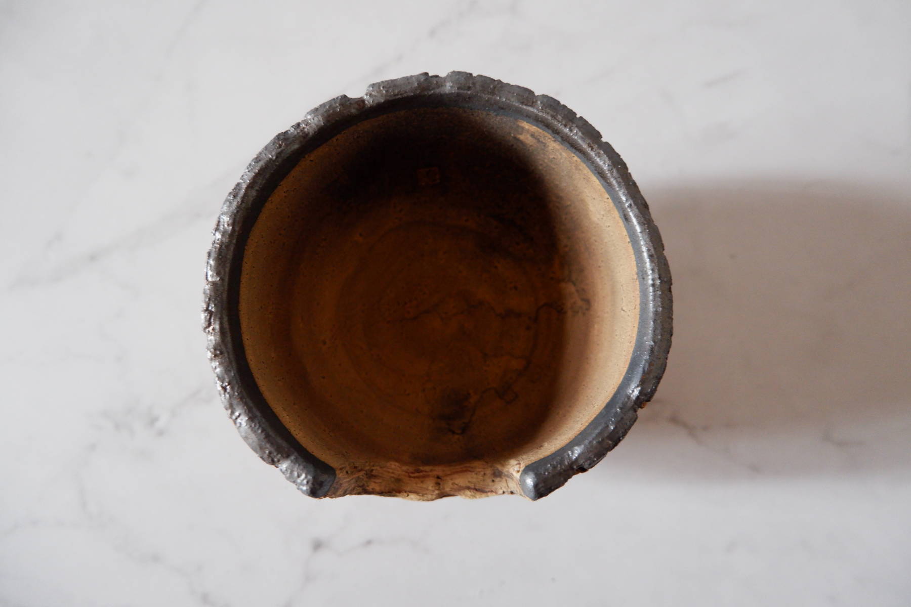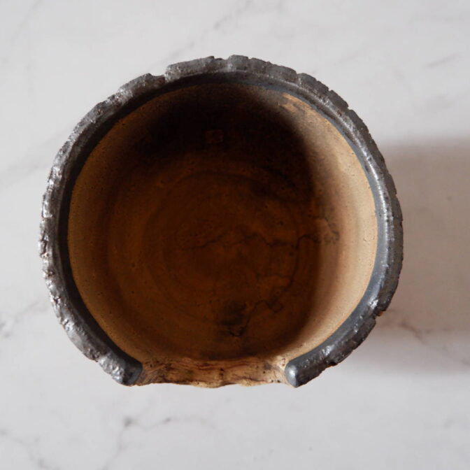 発色と一定の強度のために極薄の黒薬で全体を覆っていますが、無施薬の焼き締め(一般的に「素焼き」と呼ばれる素材)のような親水性があります。