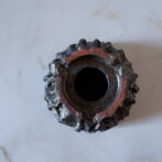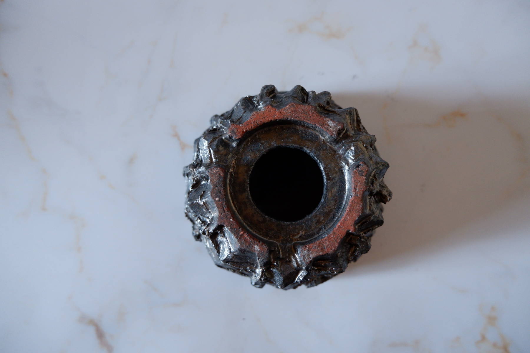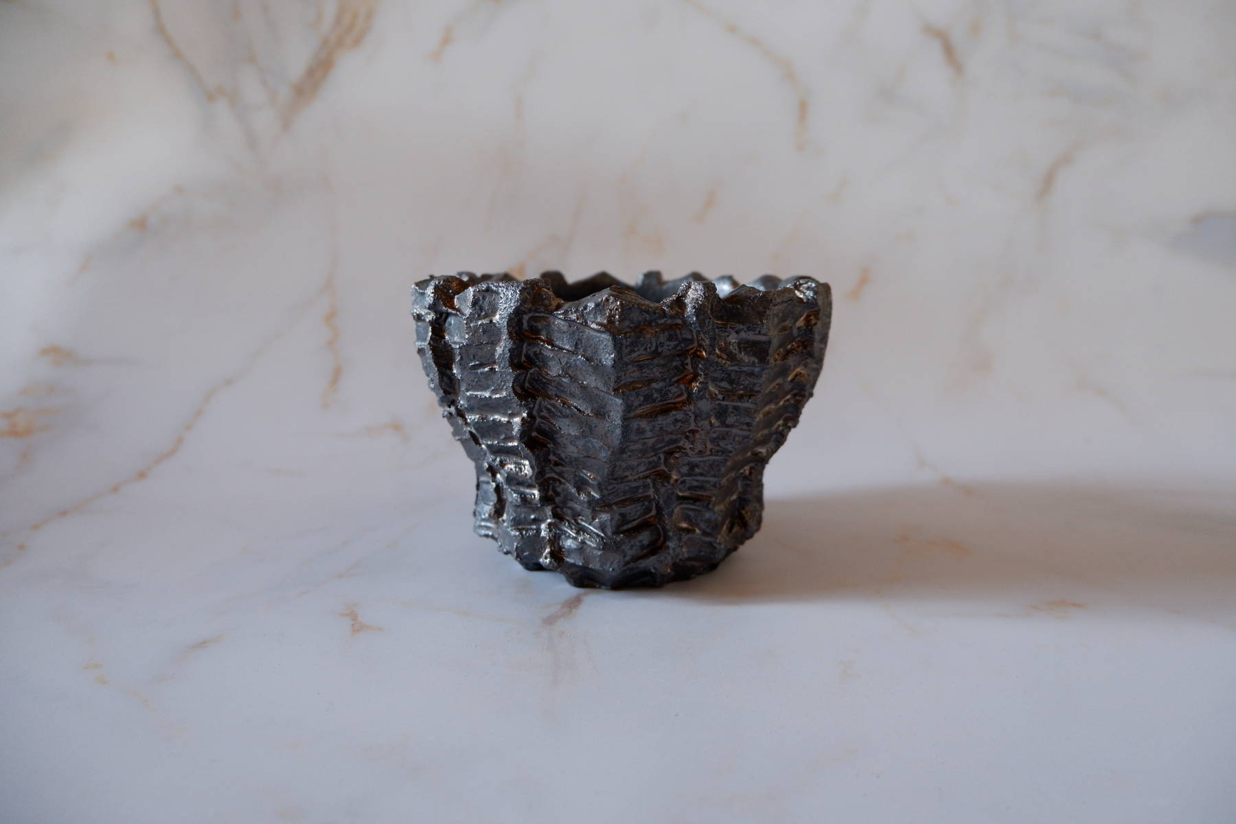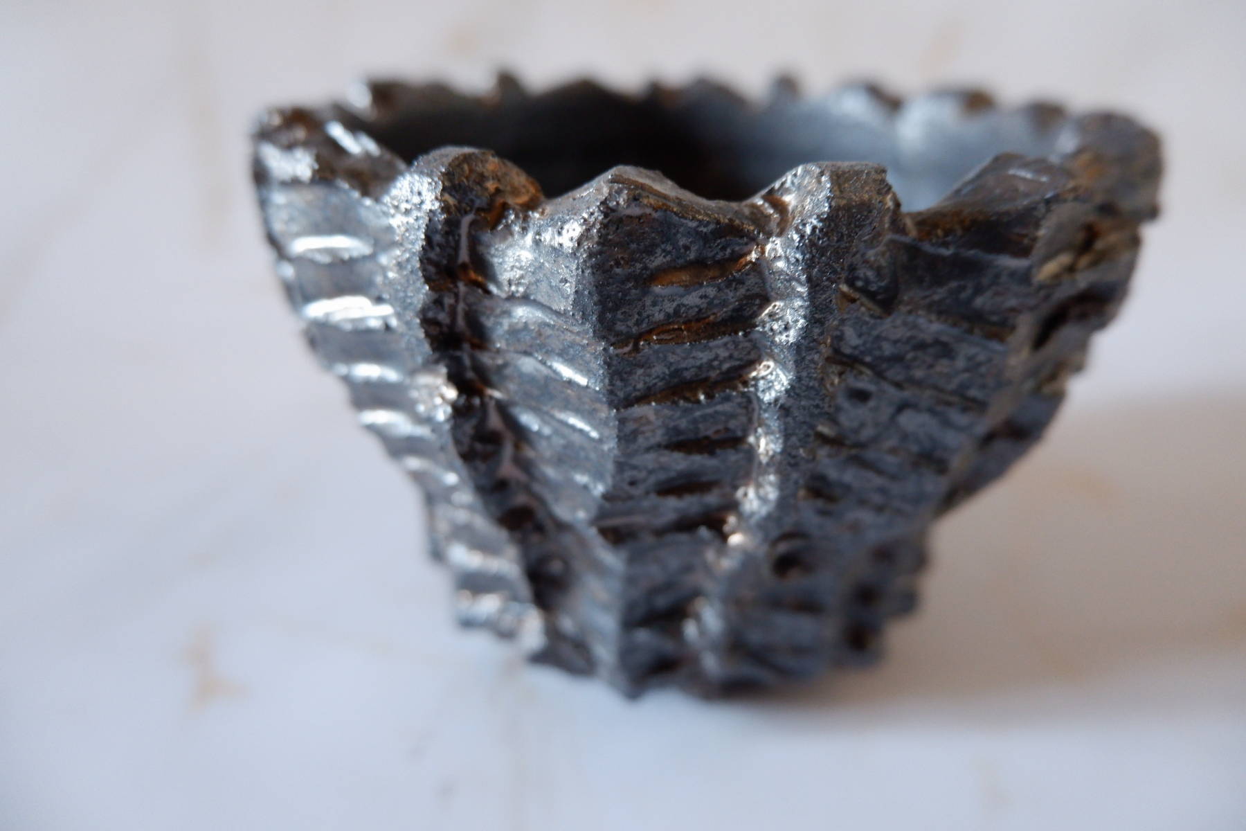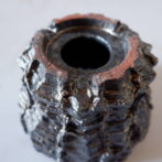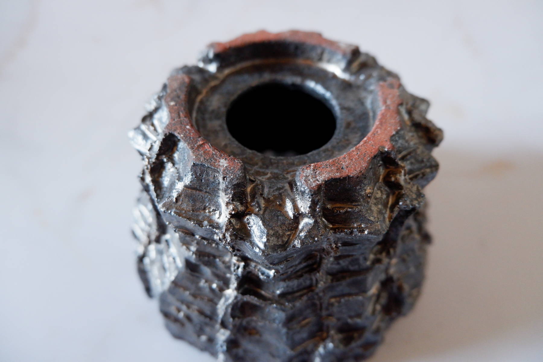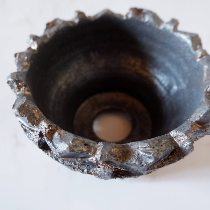 溝など釉薬が溜まって濃く掛かった部分は明るめのブロンズ色に発色していますが、全体的には光沢を抑えた、黒寄りのこげ茶です。