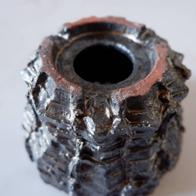 目の粗い赤土と艶を抑えた黒釉が相まって、ザラっとした独特の表情になっています。