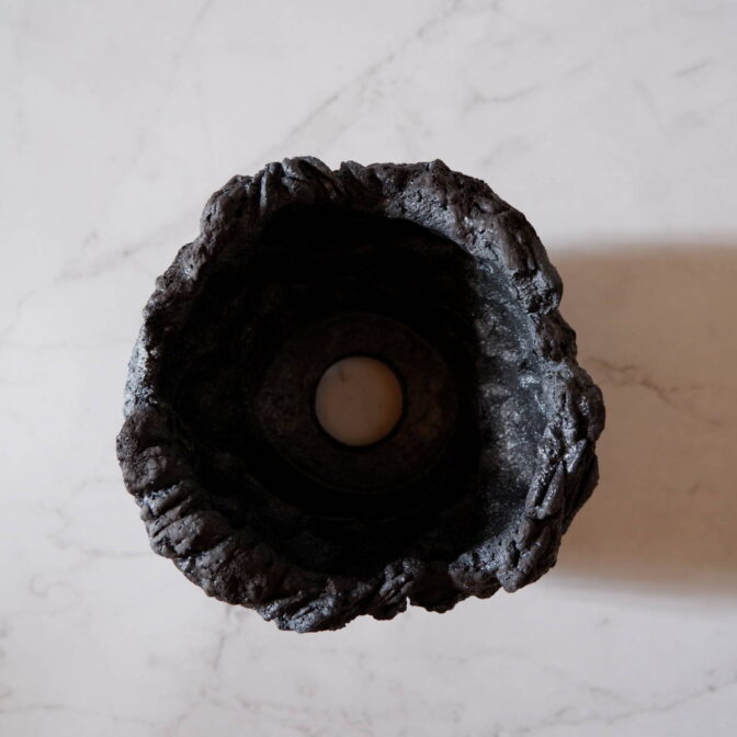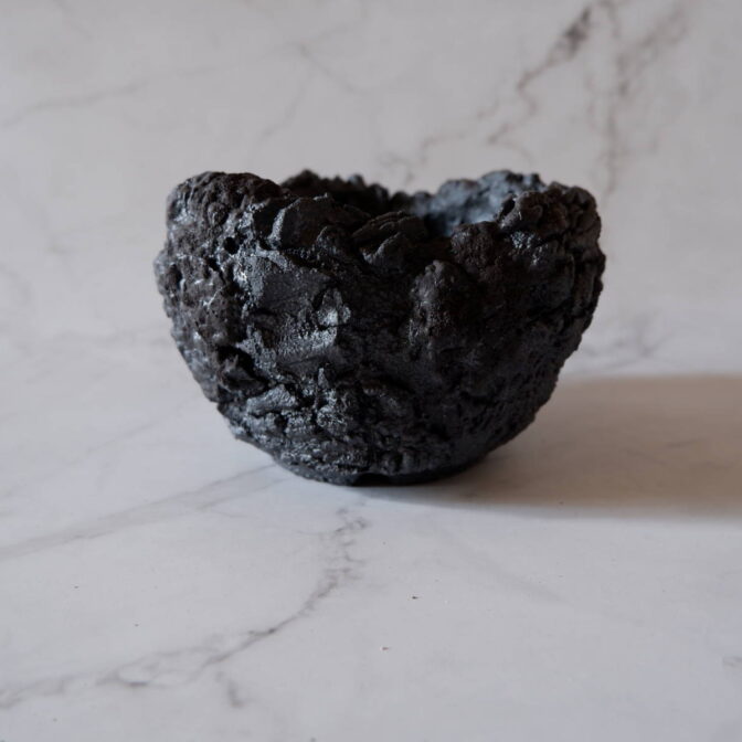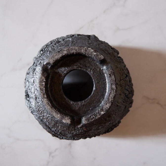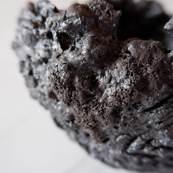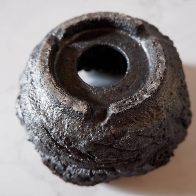 全体的には艶を抑えた黒色で、部分的に発泡系の黒い釉薬を手塗りしてアクセントにしました。