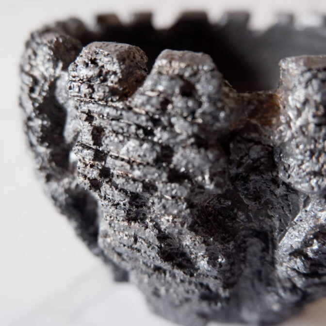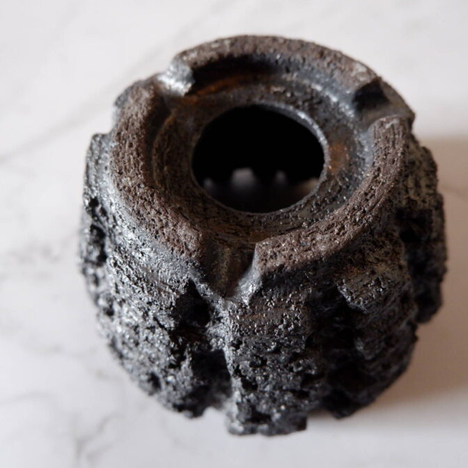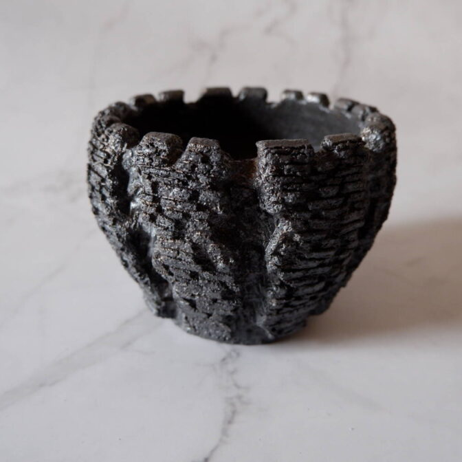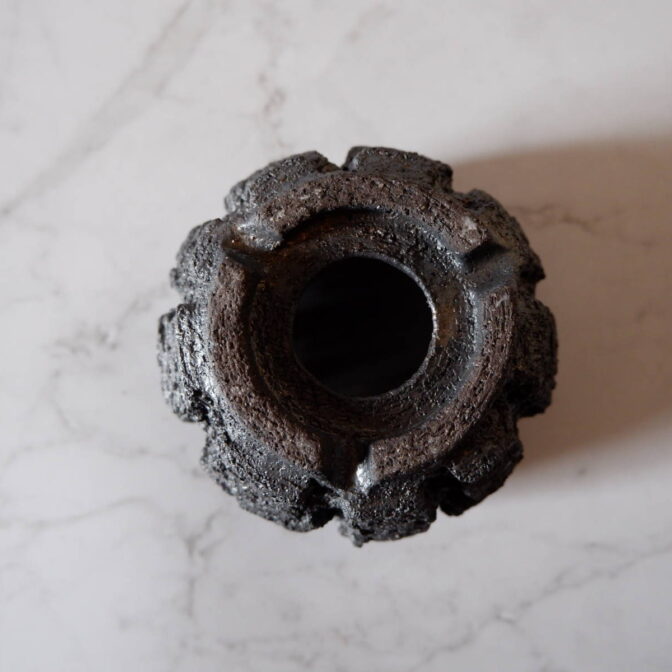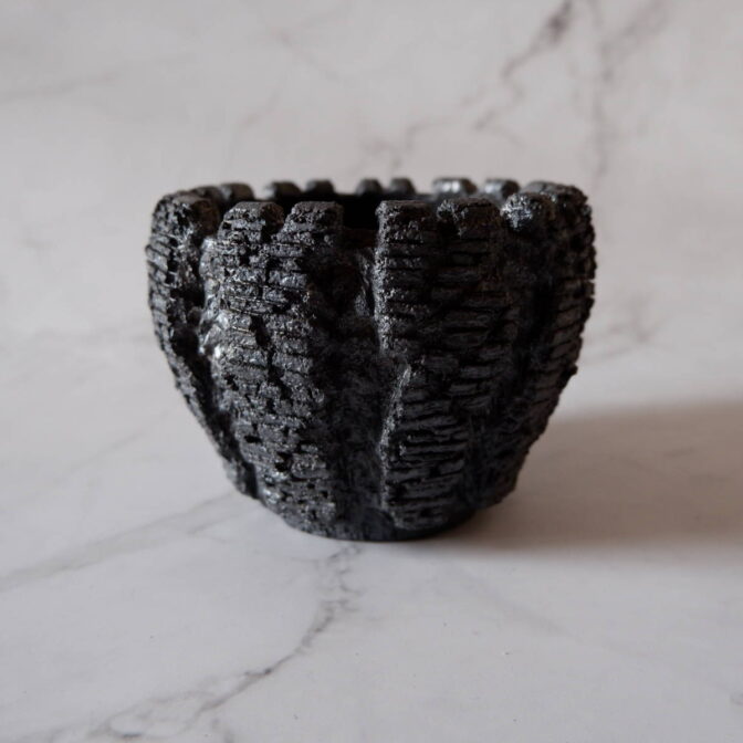 - 木のような炭のようなゴツゴツとした模様が力強く、色も素敵でした。 適度に厚みがあるのと、底穴がいくつか空いていて水捌けが良さそうなところが◎です。