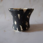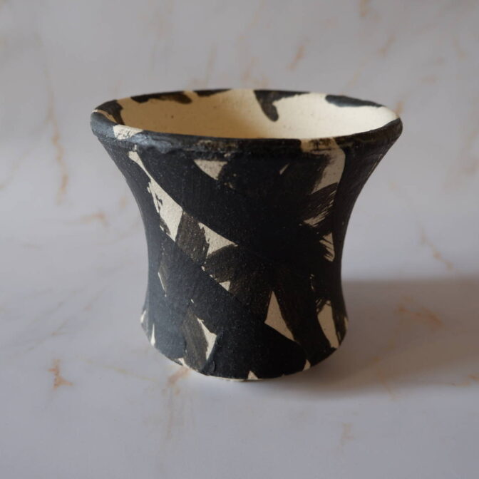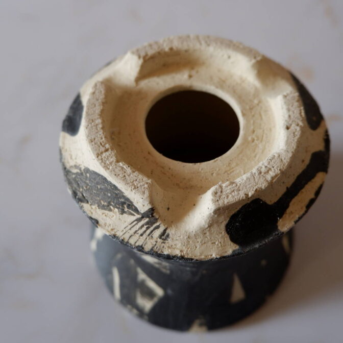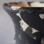 本作は、ザラっとした質感の粗目の土に、黒化粧土でこどもの落書きをイメージした模様を描きました。