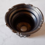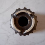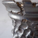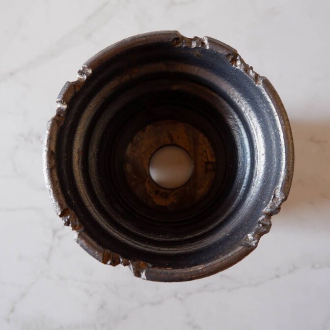 縁や溝など釉薬が溜まって濃く掛かった部分はブロンズ色が明るく発色していますが、全体的には光沢を抑えたメタリックな黒っぽいこげ茶、錆びた金属のような渋い発色です。