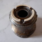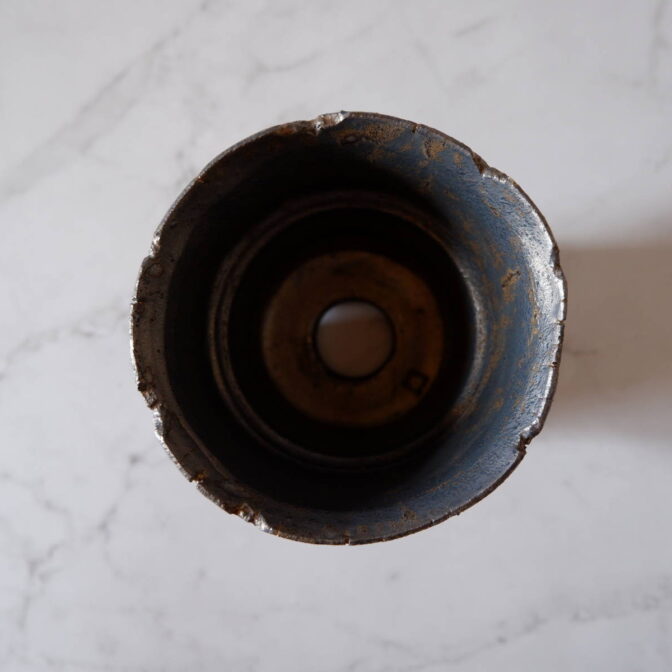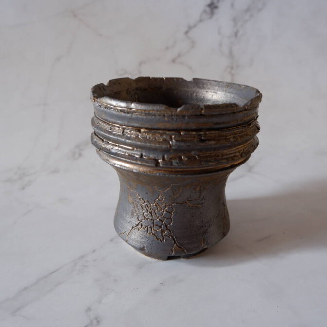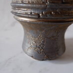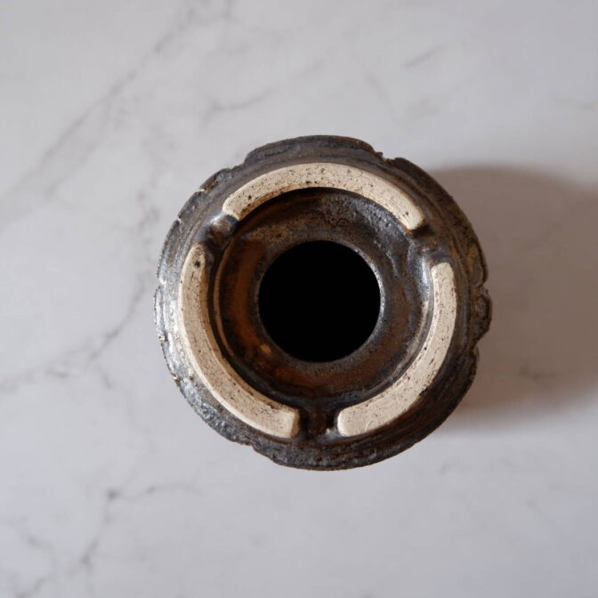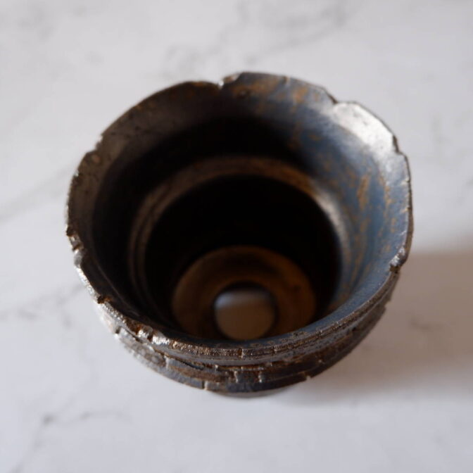 縁や溝など釉薬が溜まって濃く掛かった部分はブロンズ色が明るく発色していますが、全体的には光沢を抑えたメタリックな黒っぽいこげ茶、古い金属のような渋い発色です。