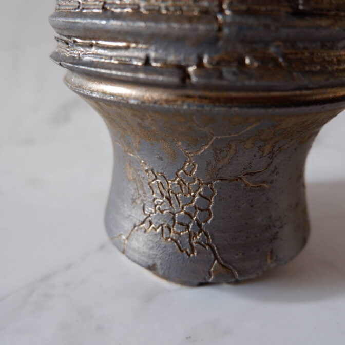 本作は、縁部分に凹凸の高低差が大きい裂紋を、ボディには線彫りの模様を施しました。