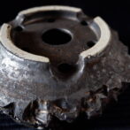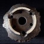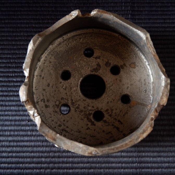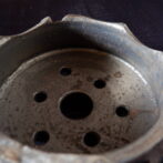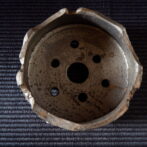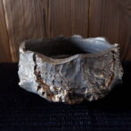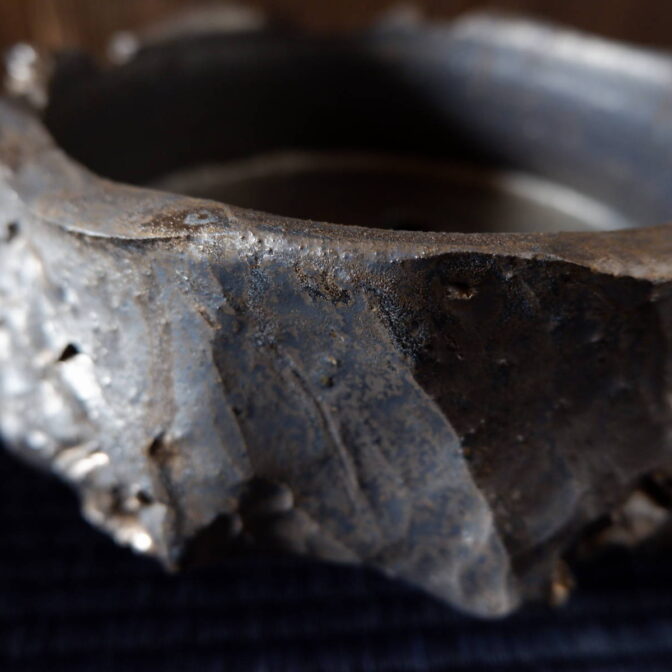 流れ模様の出る光沢を抑えた釉薬が、古びた金属のような錆感のある表情を見せています。