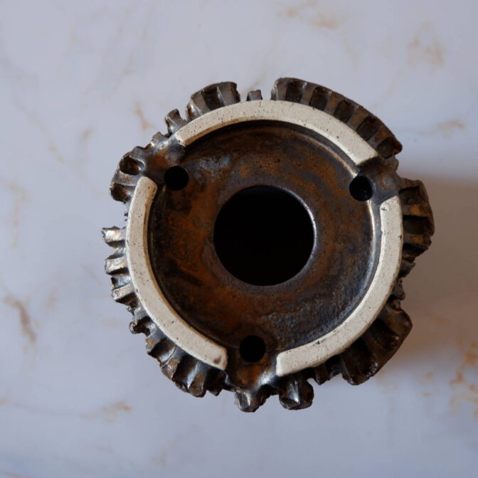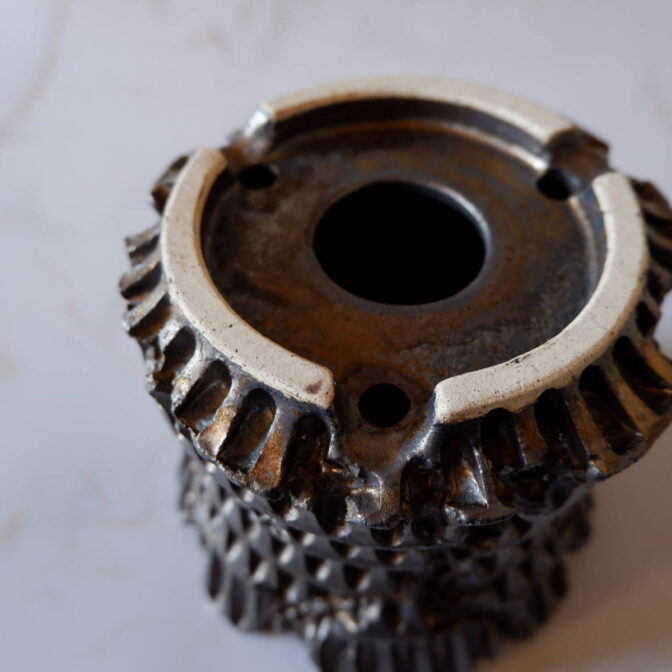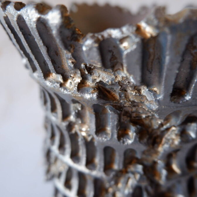縁や溝など釉薬が溜まって濃く掛かった部分はブロンズ色が明るく発色していますが、全体的には光沢を抑えたメタリックな黒っぽいこげ茶、錆びた金属のような渋い発色です。