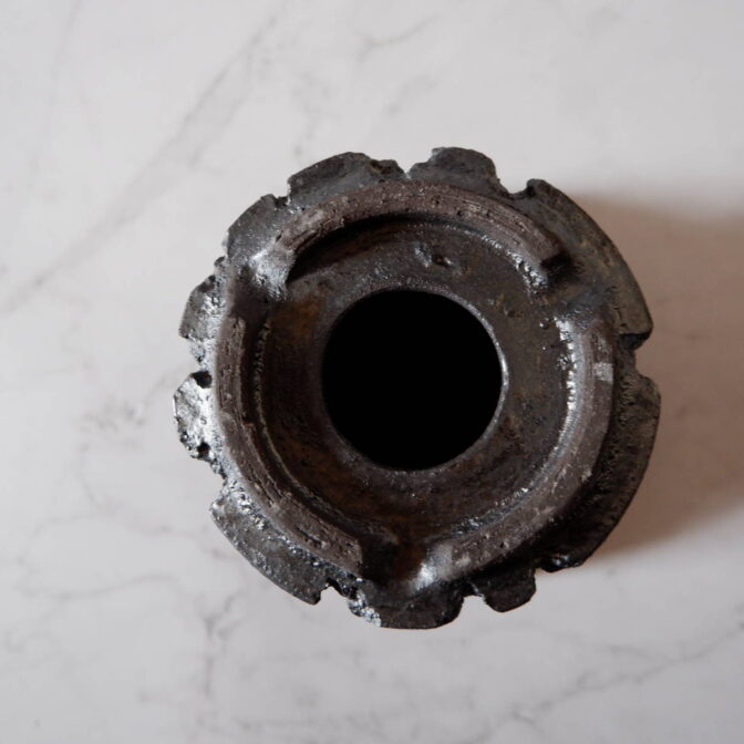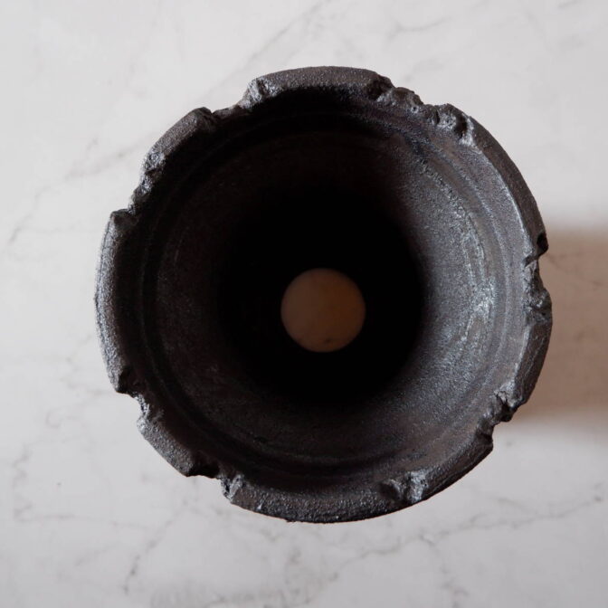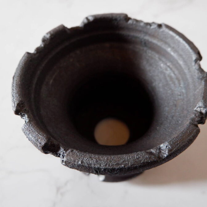 艶を抑えた黒釉は所々に結晶のような細かい凹凸が現われ、粗い土肌と相まって単調ではない質感です。