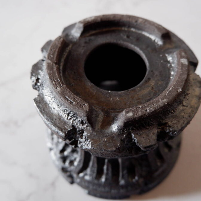 本作は、深さのある鎬模様を作り、荒いひび割れやクラックを加えました。