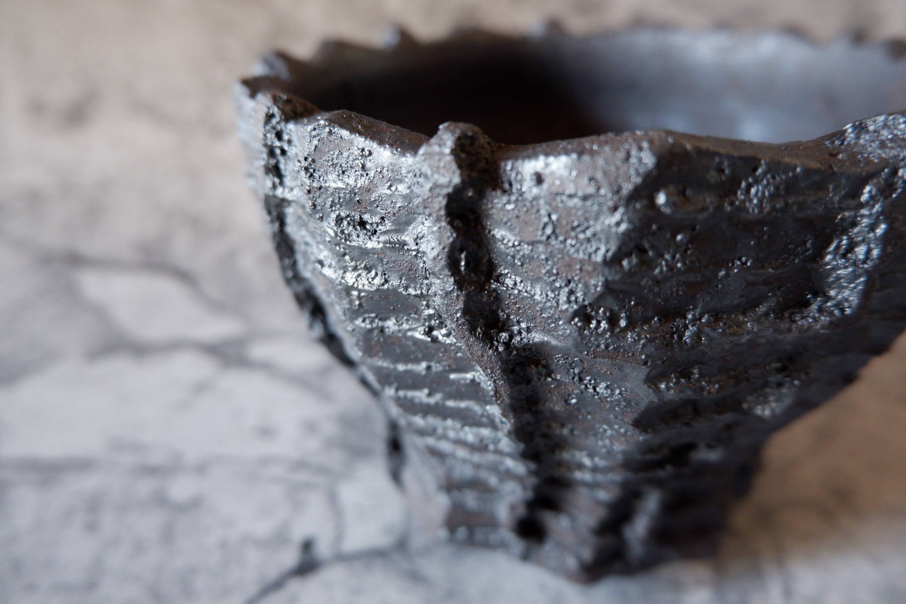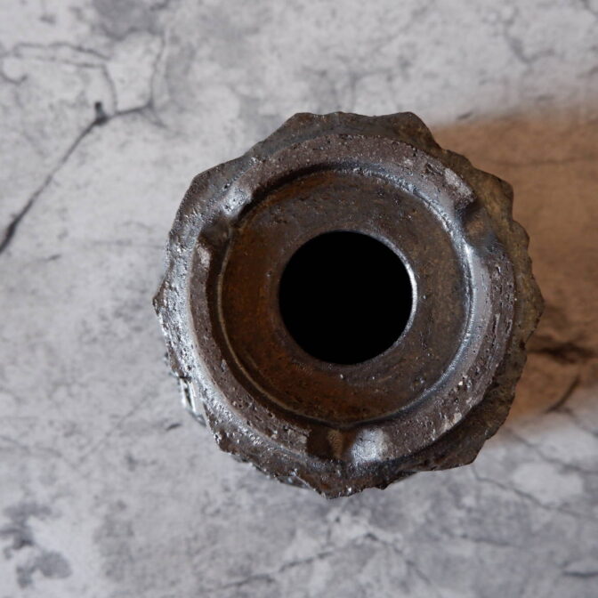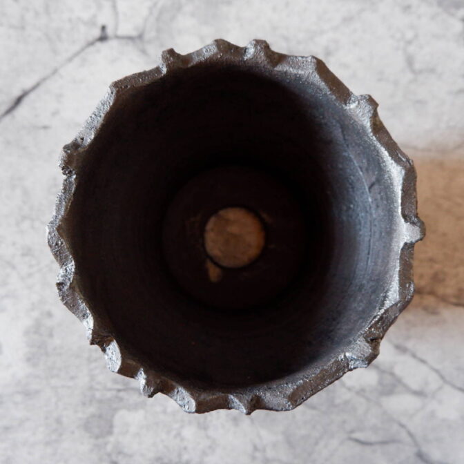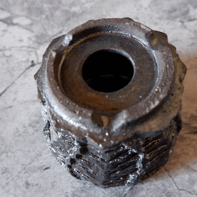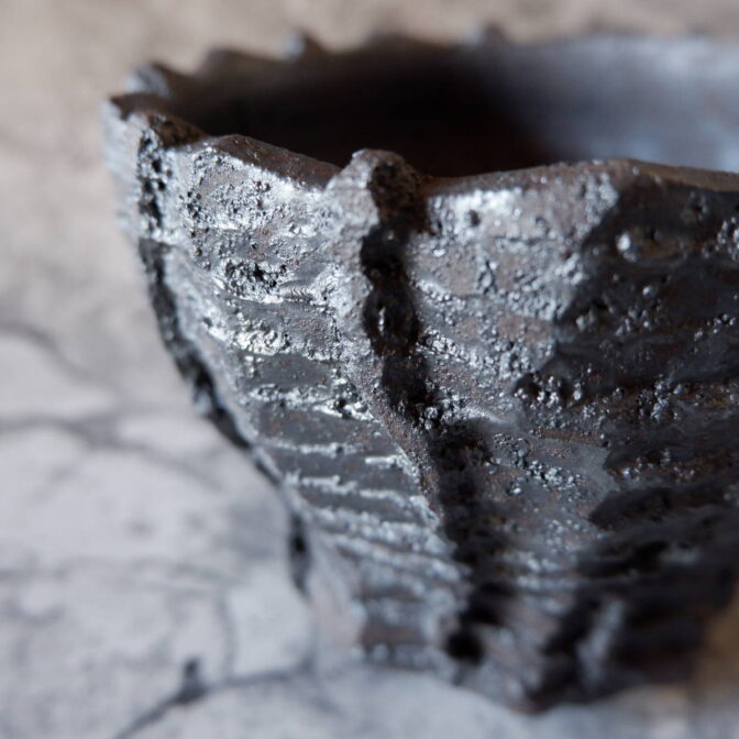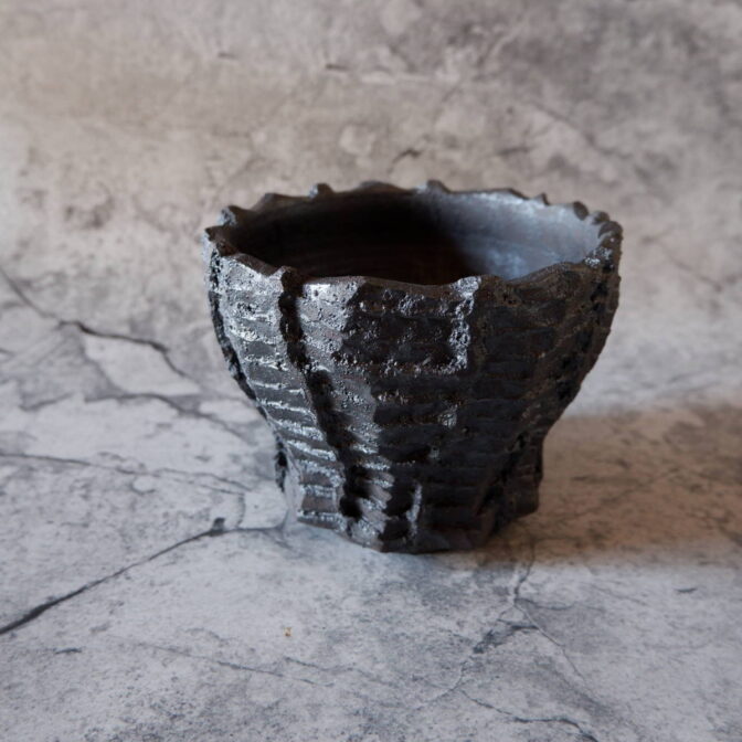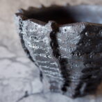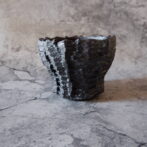 艶を抑えた黒釉は所々に結晶のような凹凸のあるランダムな模様が現われ、粗い土肌と相まって表情豊かです。